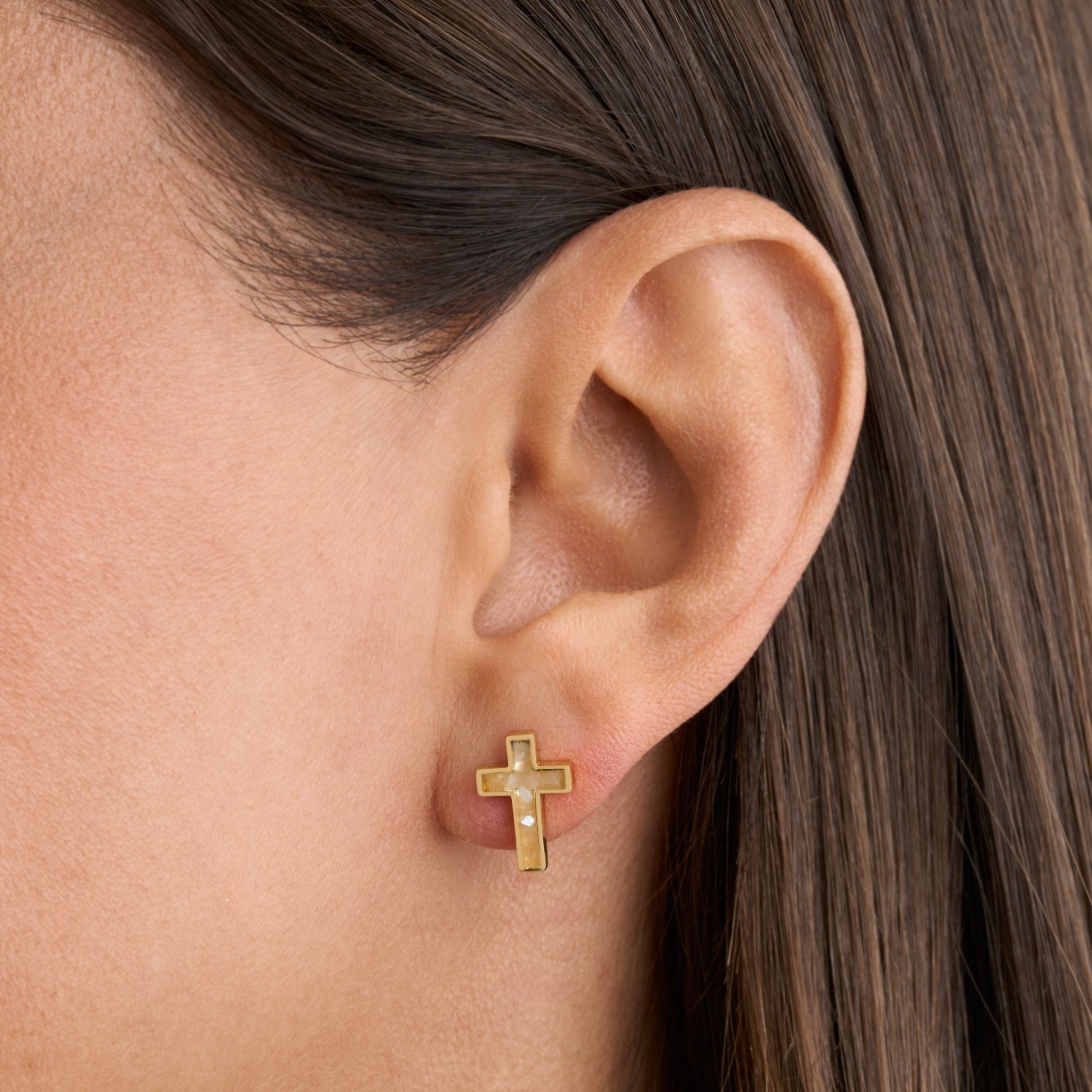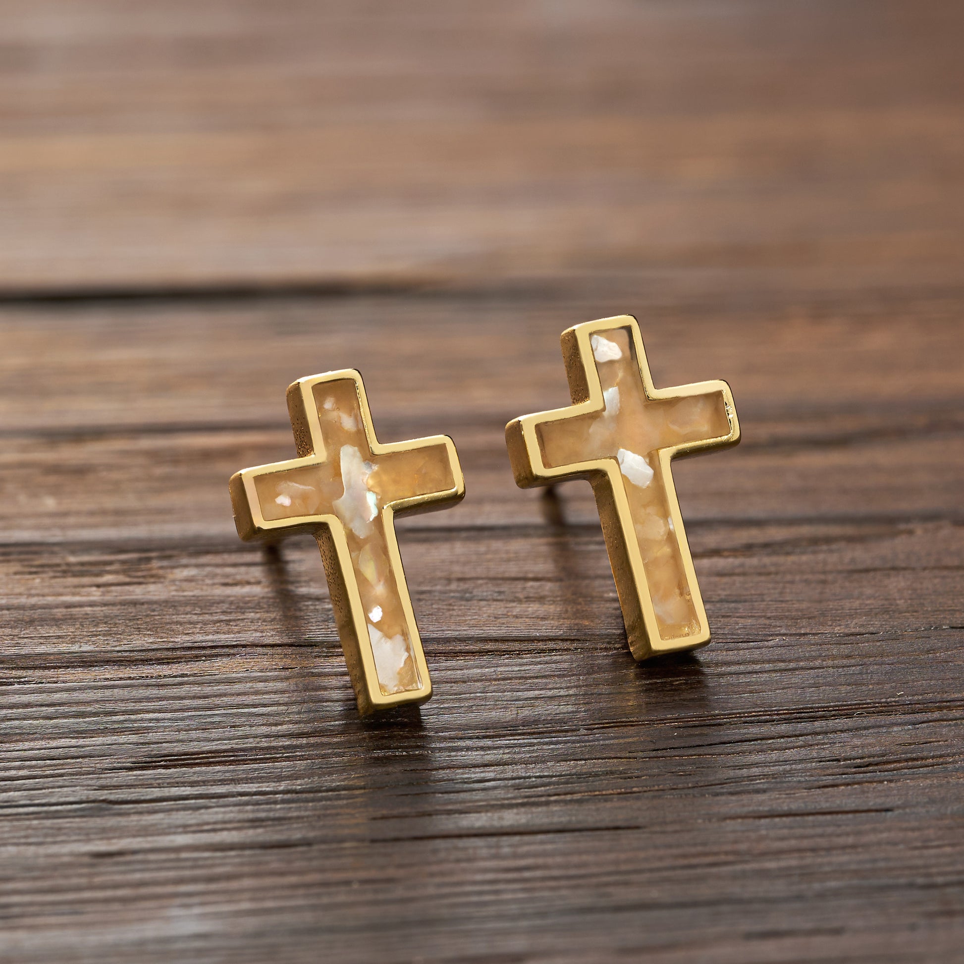Blending simplicity and elegance, the Gold Sterling Silver Mother of Pearl Cross Studs are a lovely expression of faith.