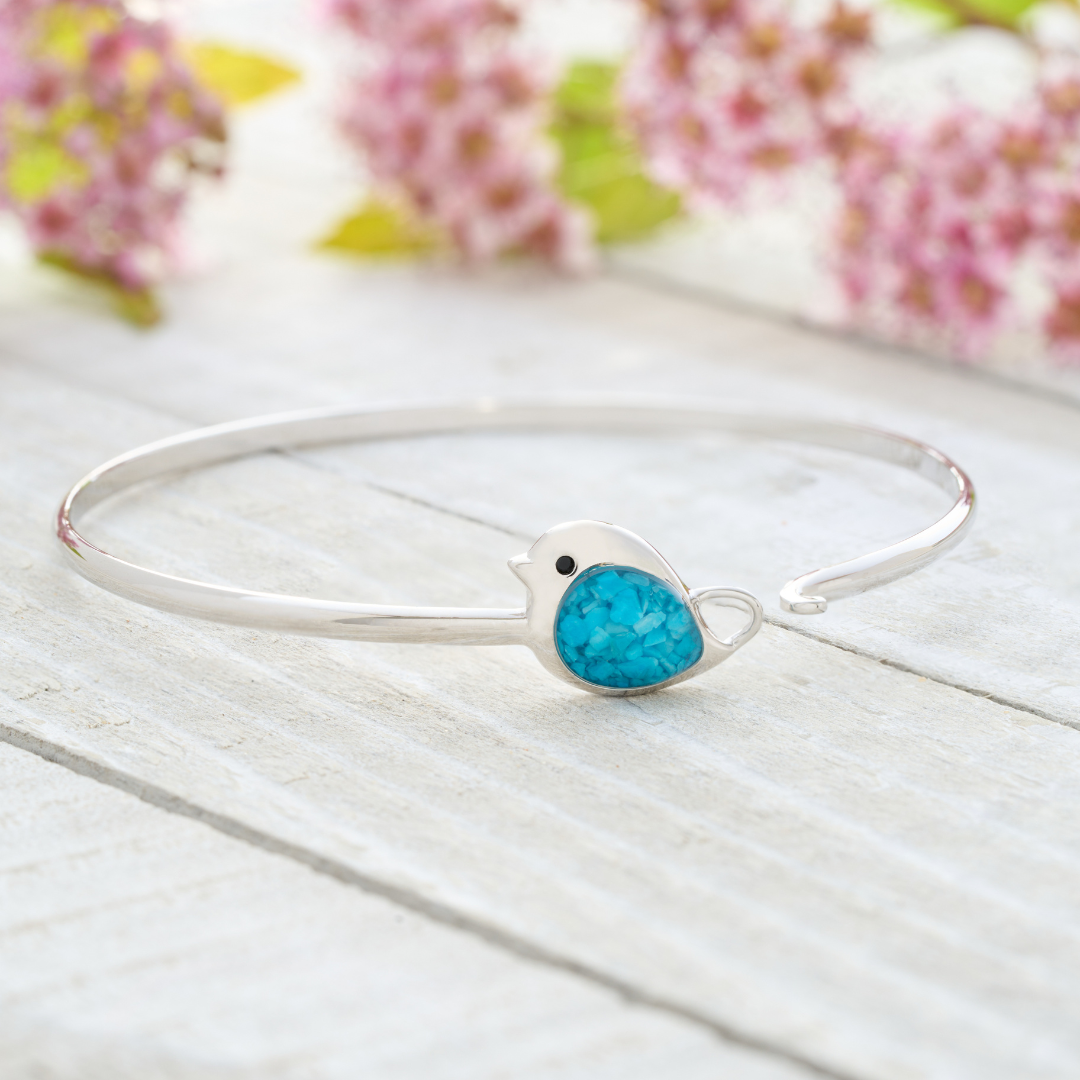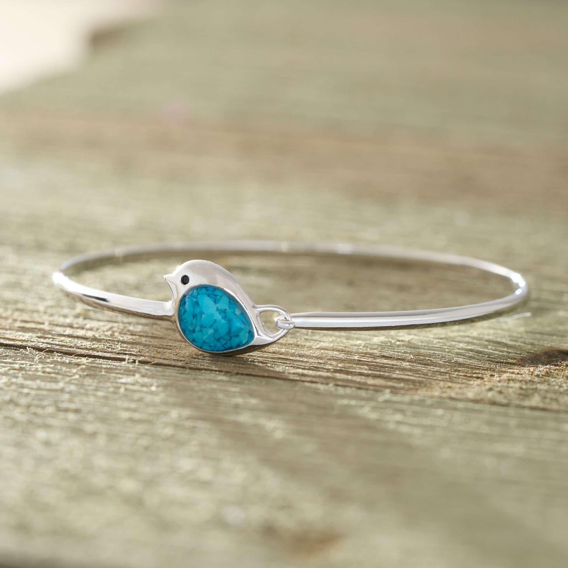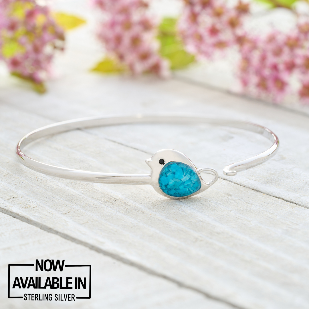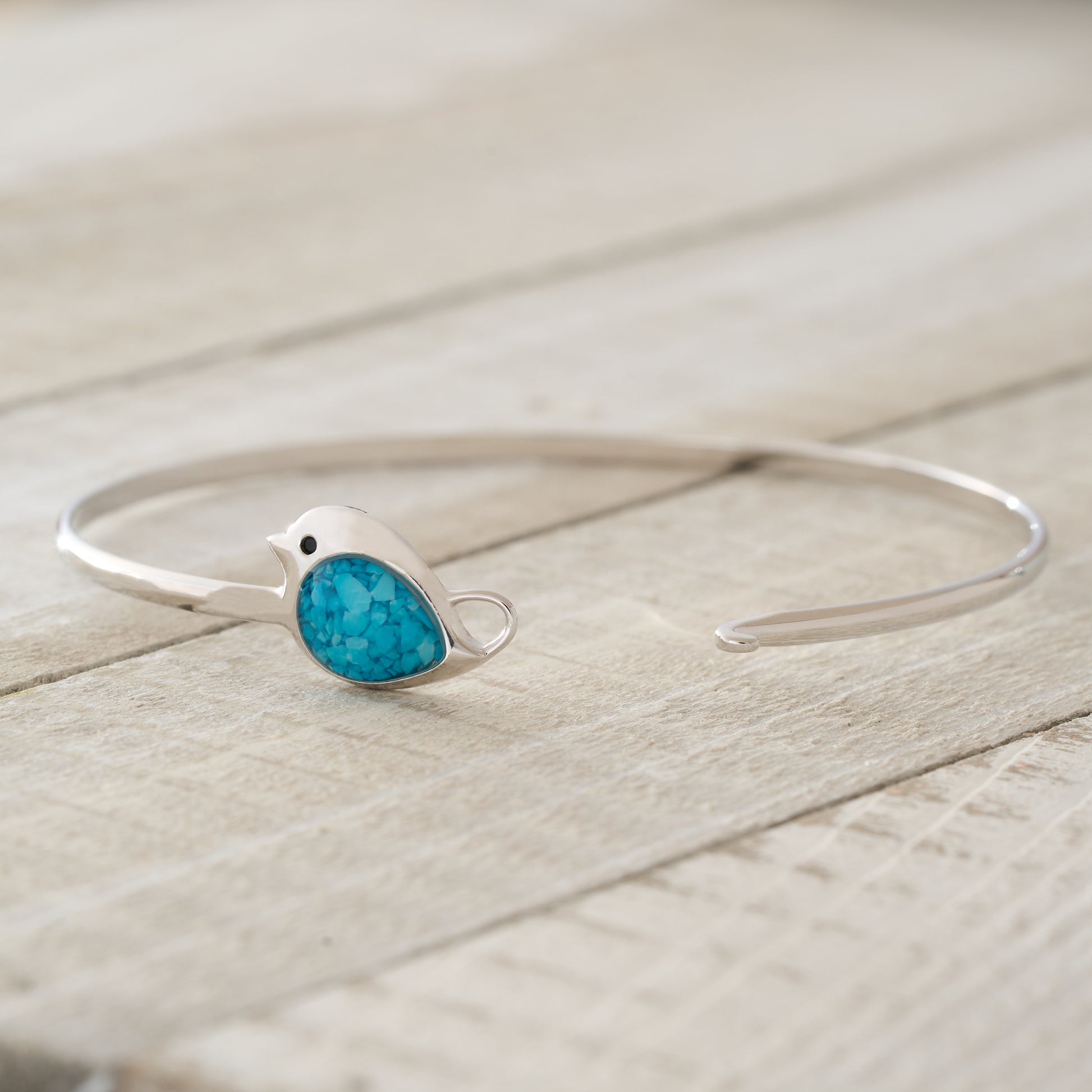 Featuring a perched bird inlaid with crushed turquoise, this bracelet brings together earthy texture and timeless style. Available in your choice of rhodium-plated brass or sterling silver, it offers a beautifully polished look with meaningful design—perfect for both everyday wear and special occasions.