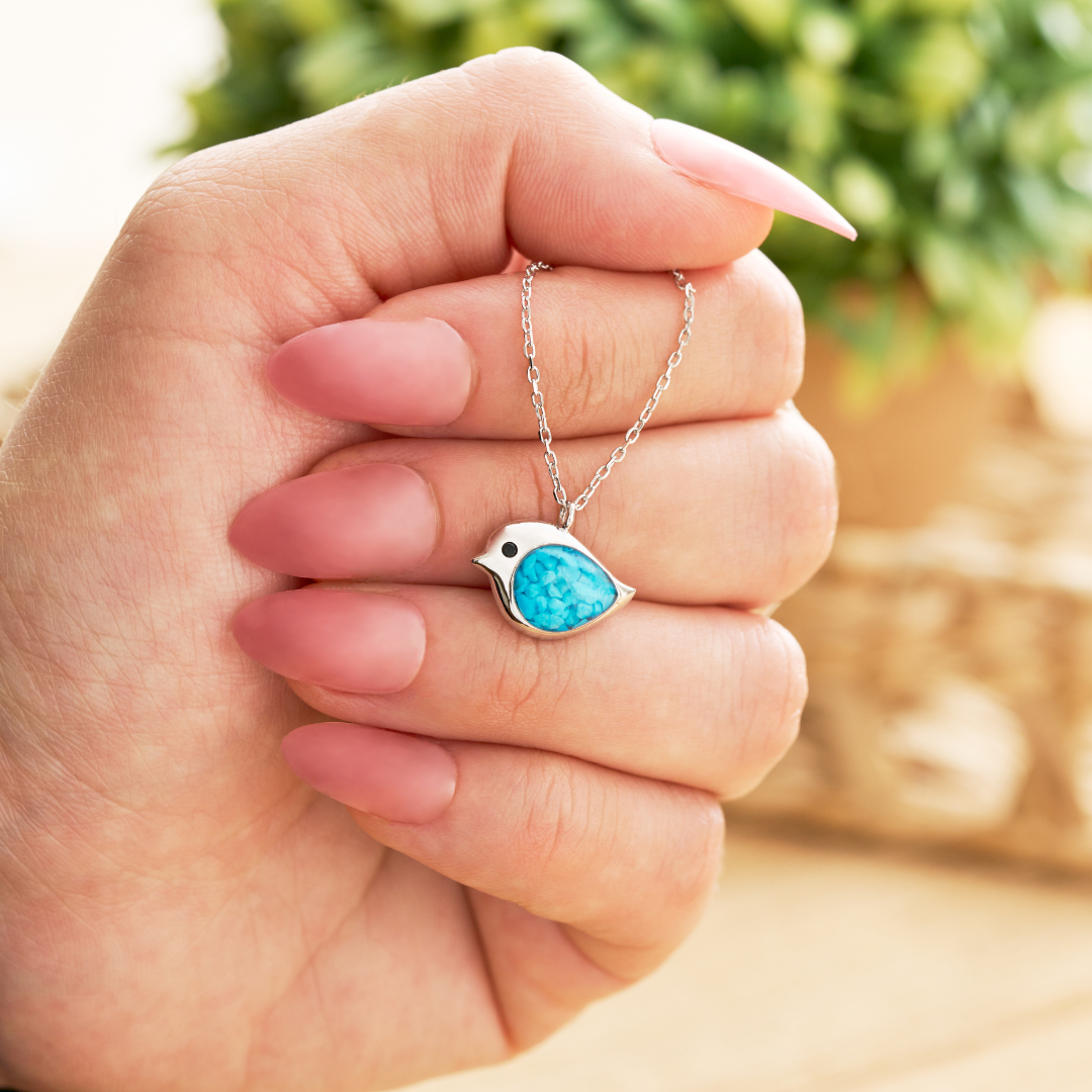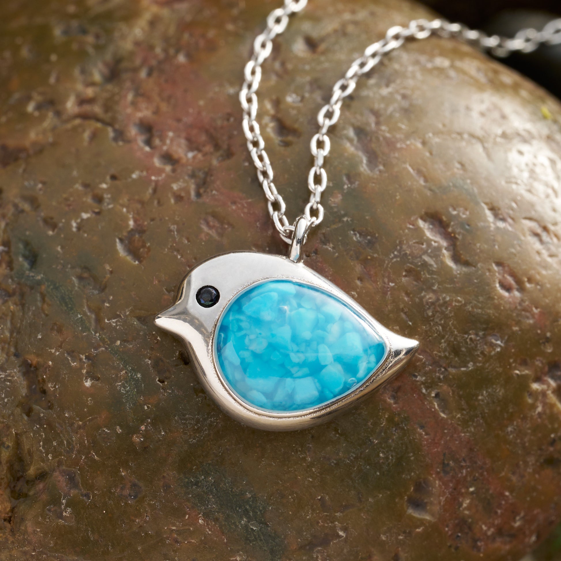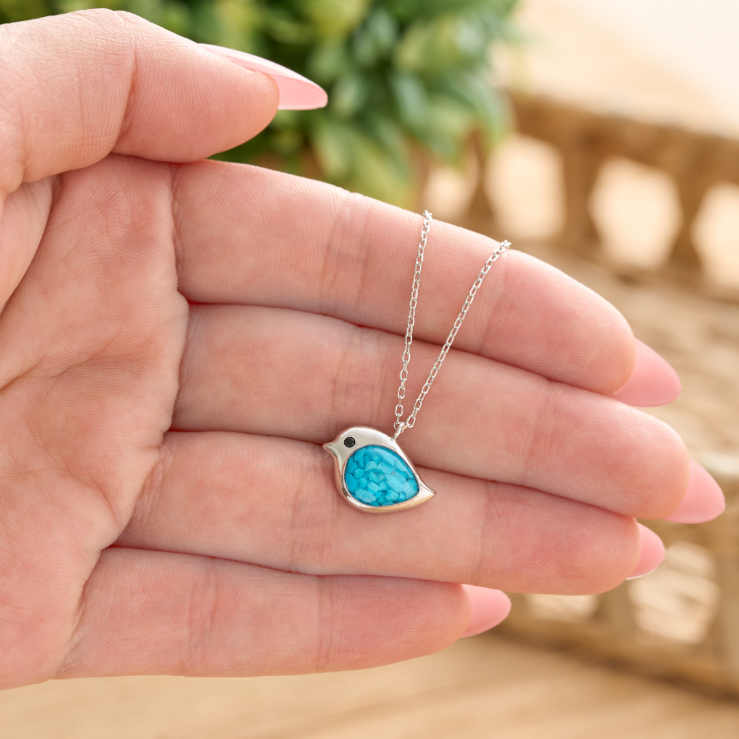Handcrafted from high-quality sterling silver and finished with rhodium plating for lasting shine, this charming pendant features a peaceful bird inlaid with crushed turquoise in resin and accented with a black cubic zirconia eye. Paired with an adjustable sterling silver chain, it’s a versatile piece that complements both casual and professional outfits.