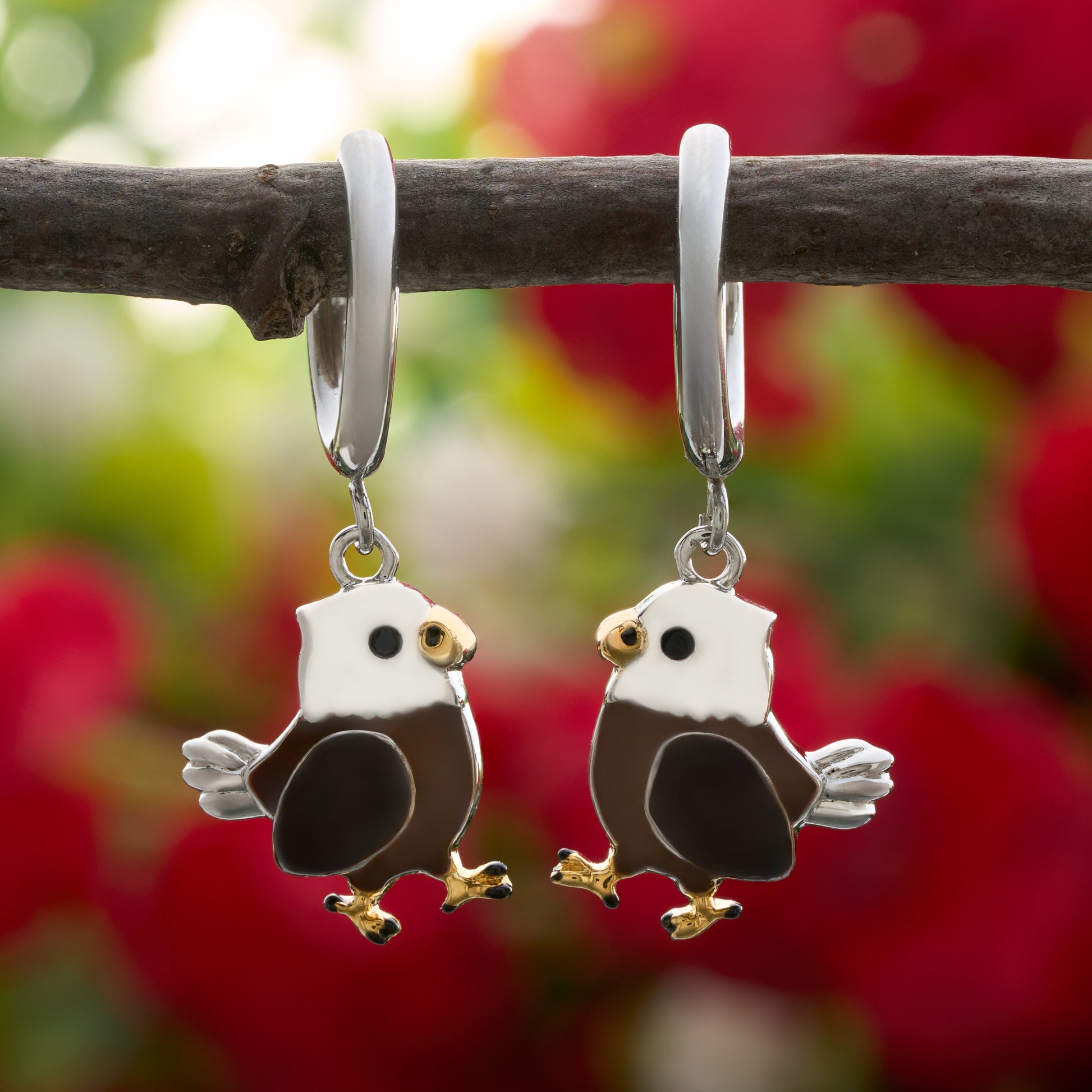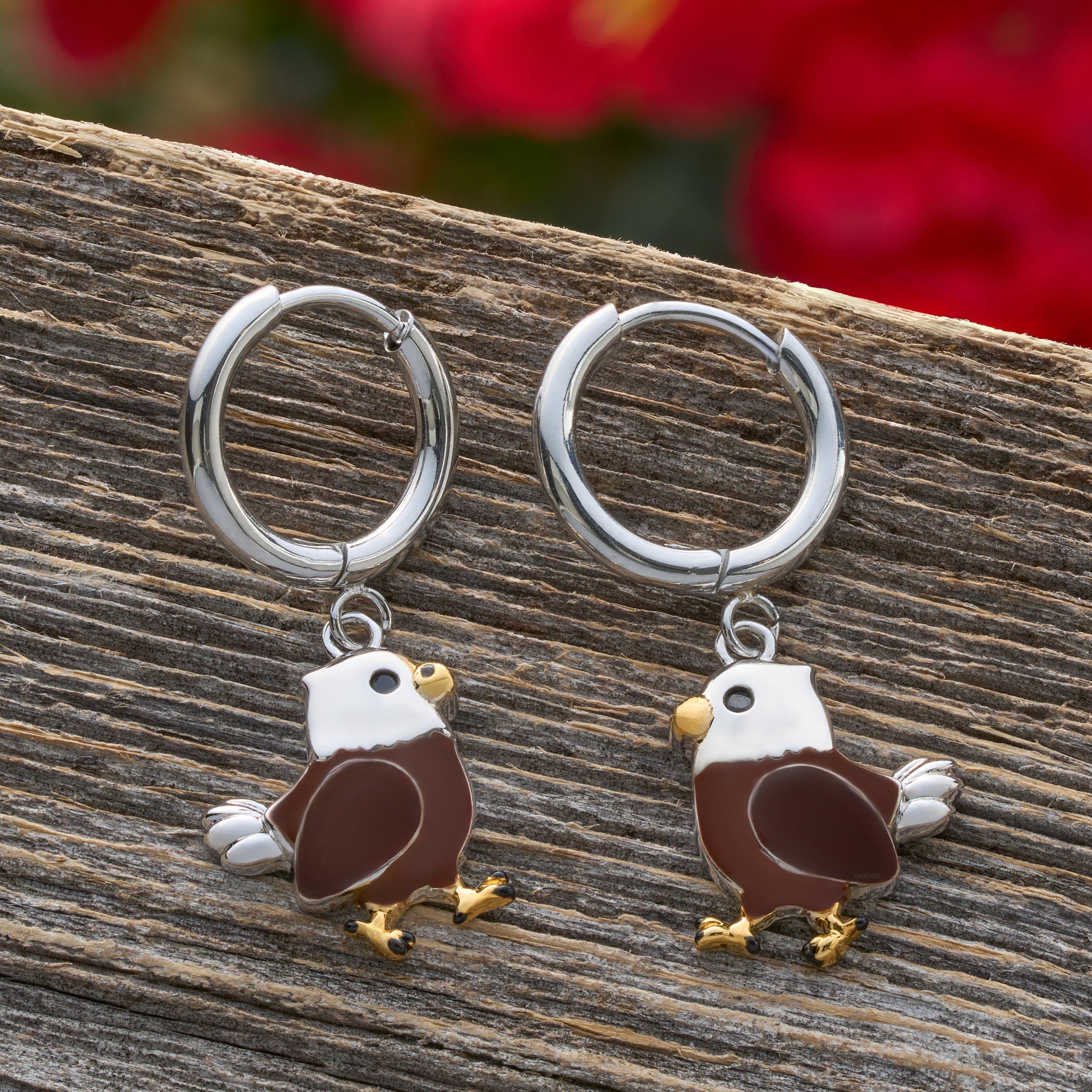 Each earring features a delicately enameled eagle pendant, suspended from a lightweight stainless steel hoop. The rhodium finish adds texture and charm, making these earrings a perfect companion to both laid-back summer looks and nature-inspired ensembles.
