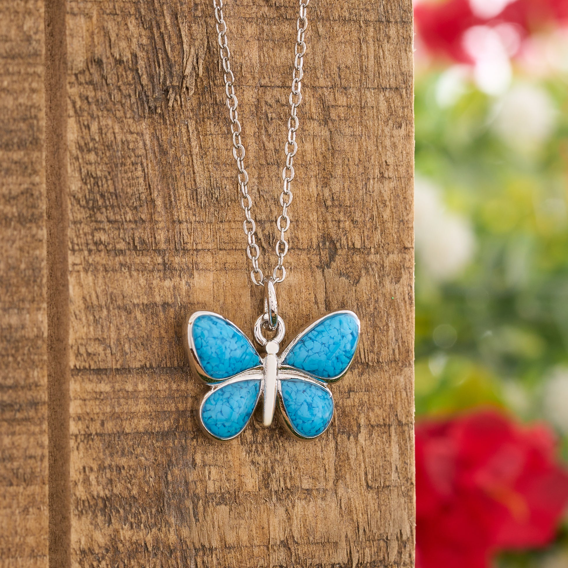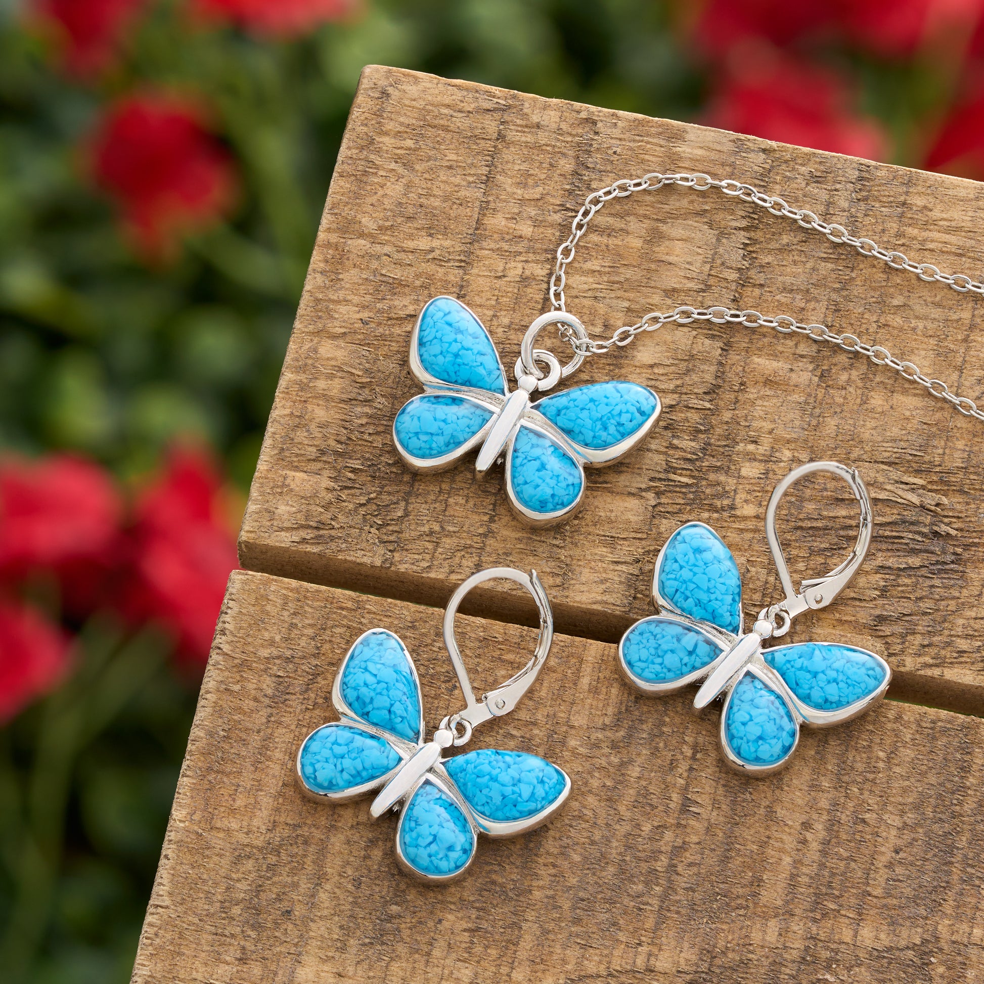 This handmade set includes both the Blue Glass Butterfly Necklace and matching Leverback Earrings, each featuring butterfly-shaped pendants filled with crushed blue glass in resin. Rhodium plating over brass offers a sleek, modern shine, while surgical stainless steel leverbacks and an 18" stainless steel chain with a 2" extender ensure comfort and versatility. With each pendant measuring 23mm x 16mm, the pieces strike the perfect balance between delicate and eye-catching.