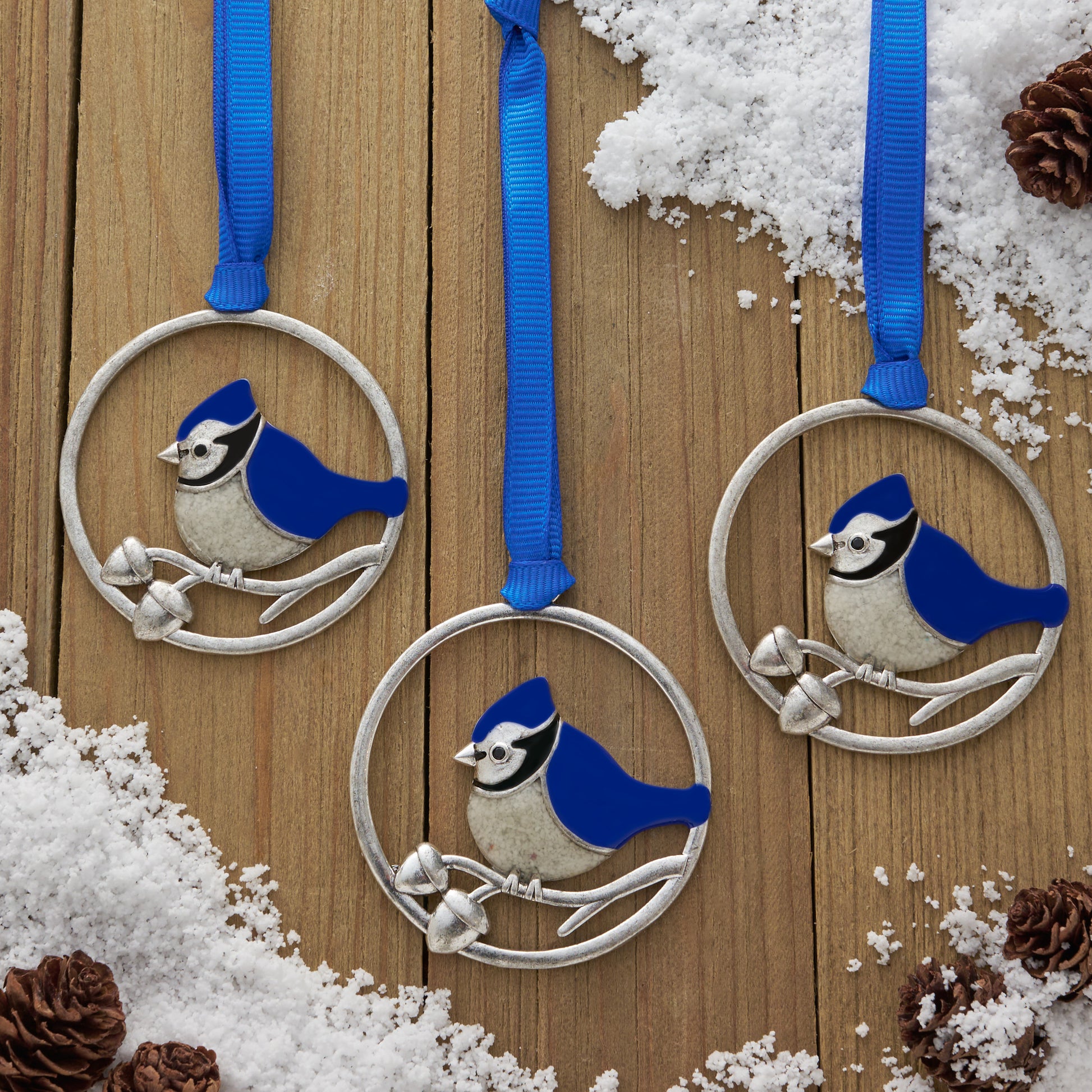 This set includes three of our best-selling Sand Blue Jay Branch Ornaments—each handcrafted from brass and finished in vintage matte silver for a softly rustic look. Featuring a perched blue jay inlaid with enamel and crushed white sand in resin, these keepsakes capture the quiet elegance of winter woodland scenes. A black cubic zirconia eye adds a subtle, sparkling touch.