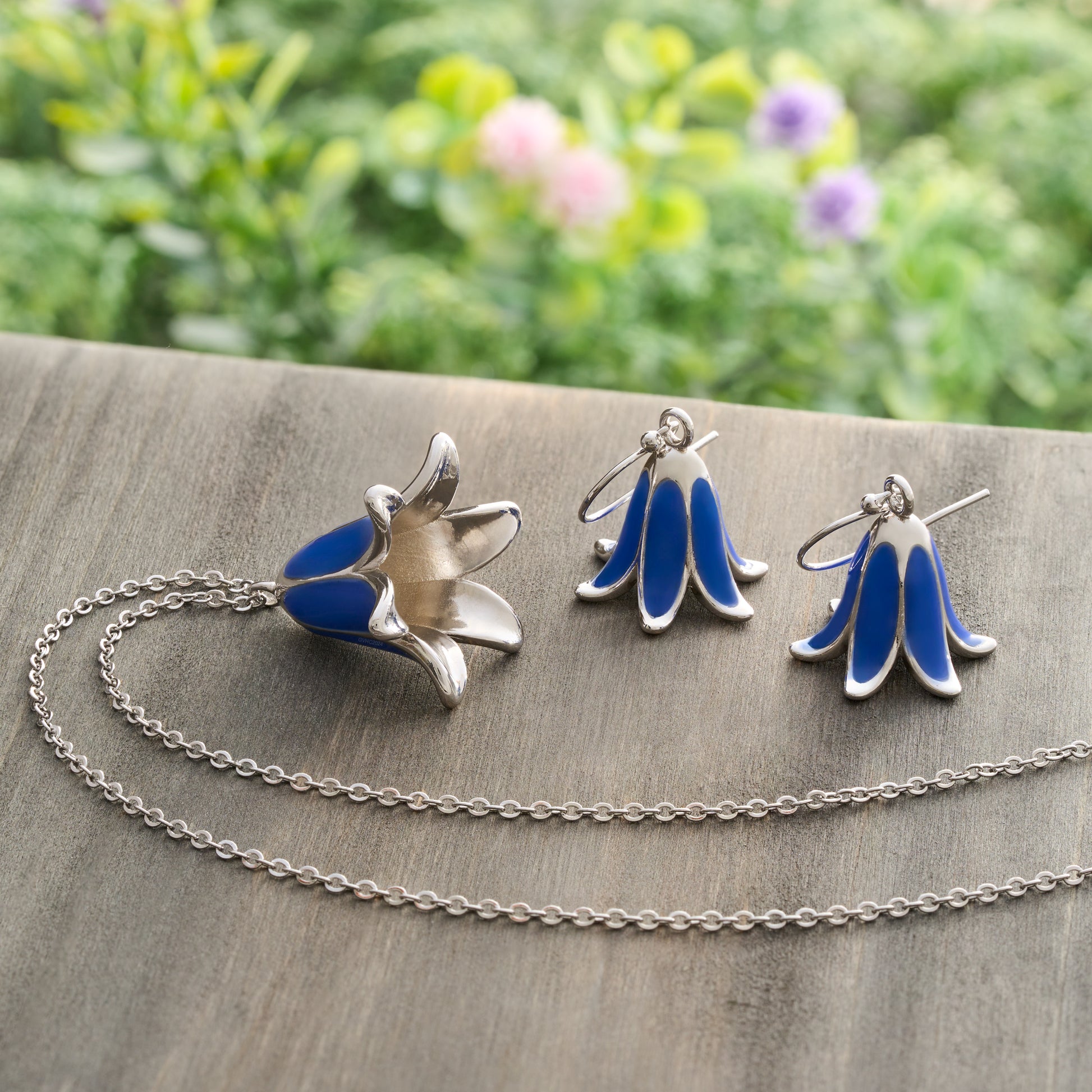 This handmade set features vivid blue enamel detailing on both necklace and earrings, crafted from rhodium-plated brass for a lasting shine. Larger than most of our traditional pieces, the statement-sized pendants make this bundle truly stand out. The earrings (18.5mm x 17.7mm) are finished with solid sterling silver French hooks for sensitive ears, while the necklace (20mm x 24mm) hangs from an 18" chain with a 2" extender.