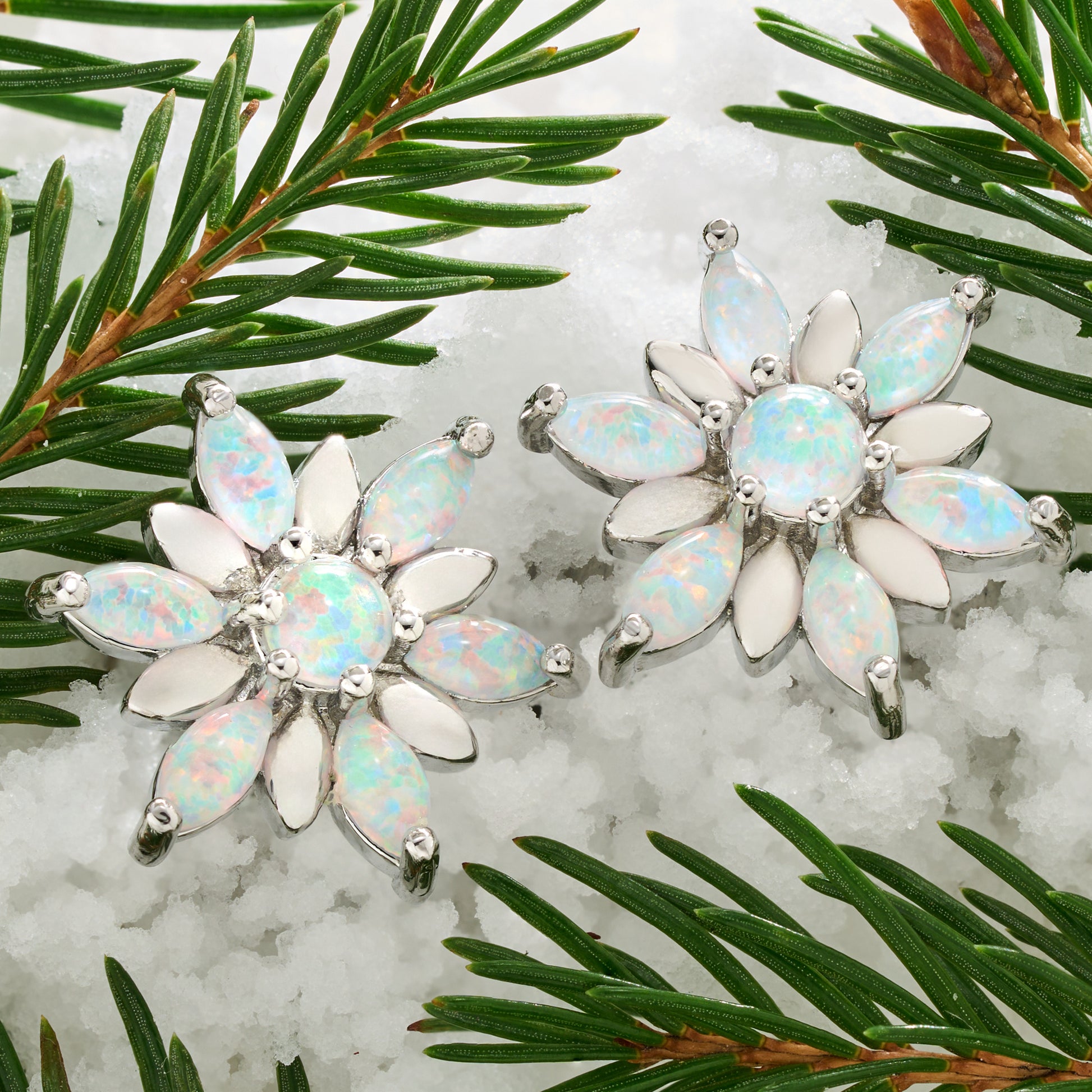 Crafted with luminous synthetic white opal, each snowflake captures the quiet beauty of winter drifting over the hills of Chadds Ford. Finished in rhodium over brass for lasting shine, the 16mm x 16mm studs are lightweight, elegant, and perfectly sized for everyday wear—festive enough for the season, yet subtle and versatile for year-round styling.