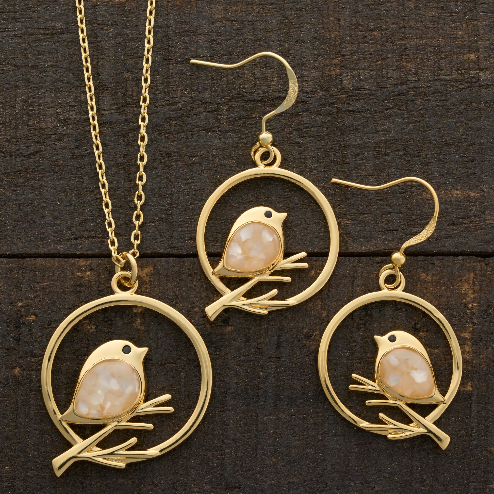 Radiant and refined, the Gold Mother of Pearl Birdie Branch Bundle includes two beautifully coordinated pieces—the Birdie Branch Earrings and the matching Necklace.