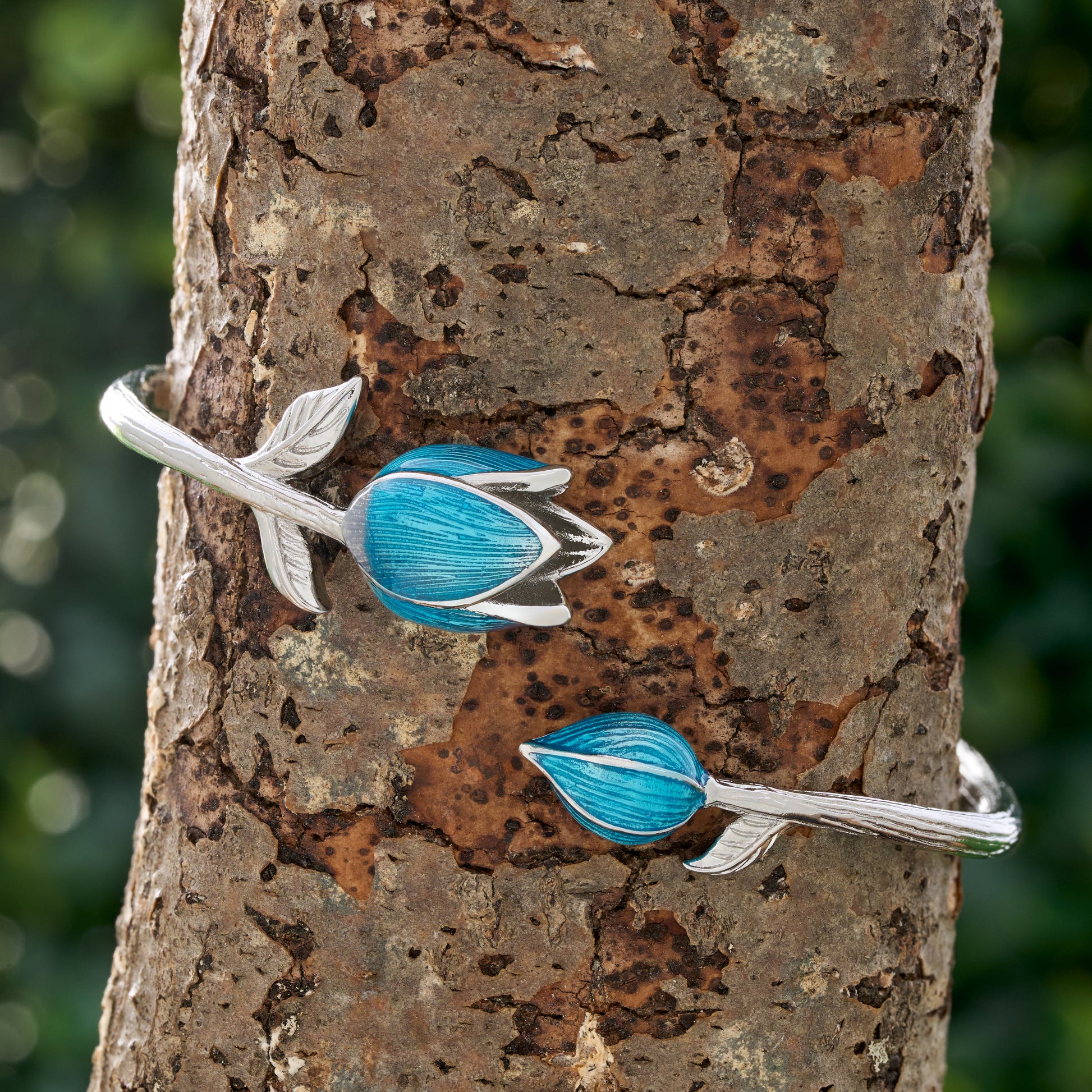 Handcrafted from brass and finished in vintage silver plating, this adjustable cuff features a delicately sculpted tulip accented with hand-painted blue enamel. The elongated bloom and gentle curves create a flowing, feminine silhouette that feels both whimsical and refined. Measuring 18mm x 12mm, the tulip offers noticeable presence while remaining balanced and easy to wear. The luminous blue enamel adds a soft, dreamlike quality that elevates the design without overwhelming it.
