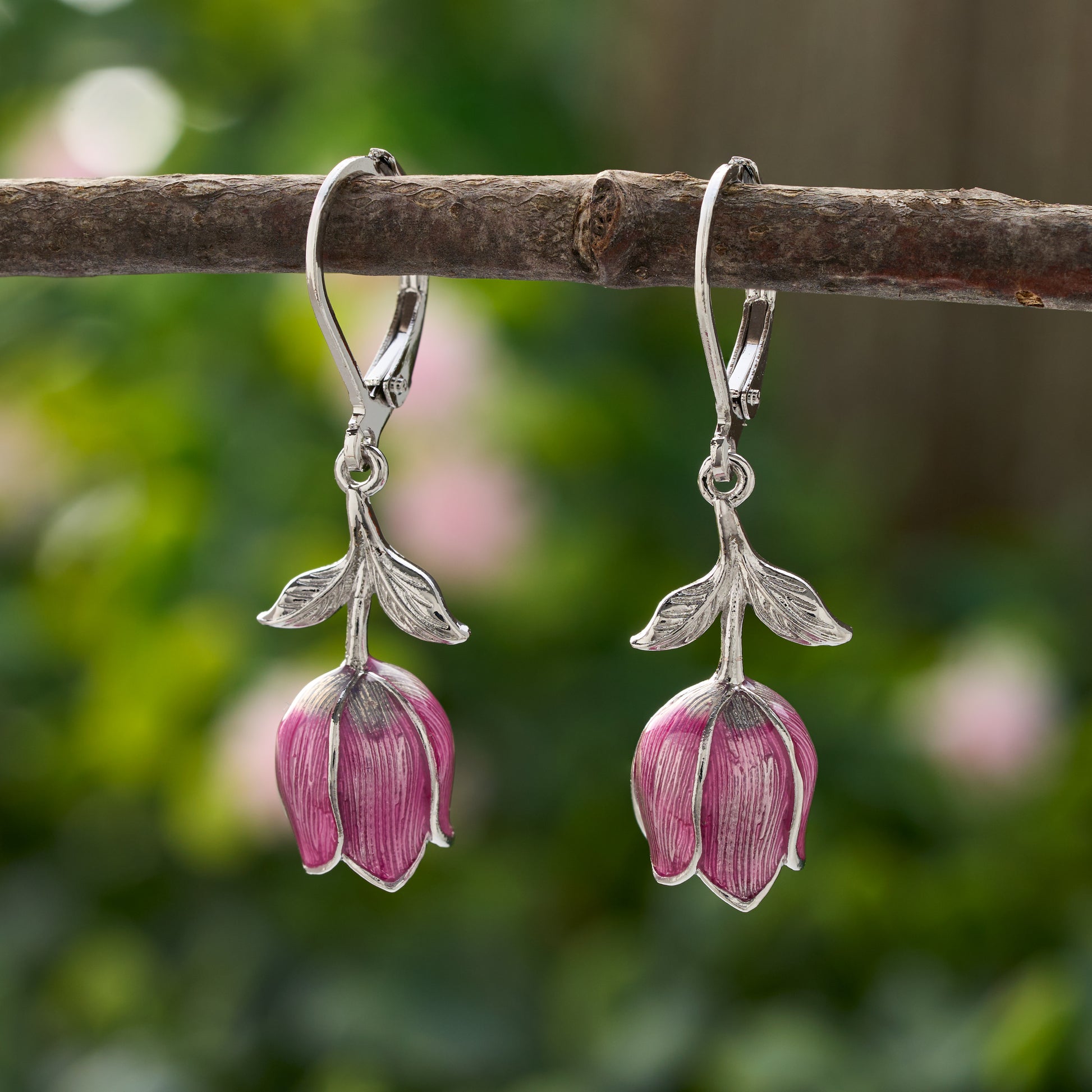 Crafted from brass and finished with rhodium plating, these hand-painted pink tulip earrings feature a delicate floral design set on hypoallergenic, surgical steel leverbacks. Each earring measures 22mm x 11mm and showcases a lightweight silhouette that’s both comfortable and versatile. Ideal for everyday wear or adding a soft, feminine touch to professional attire, the tulips are carefully painted by hand with pink enamel for a graceful, spring-inspired finish.