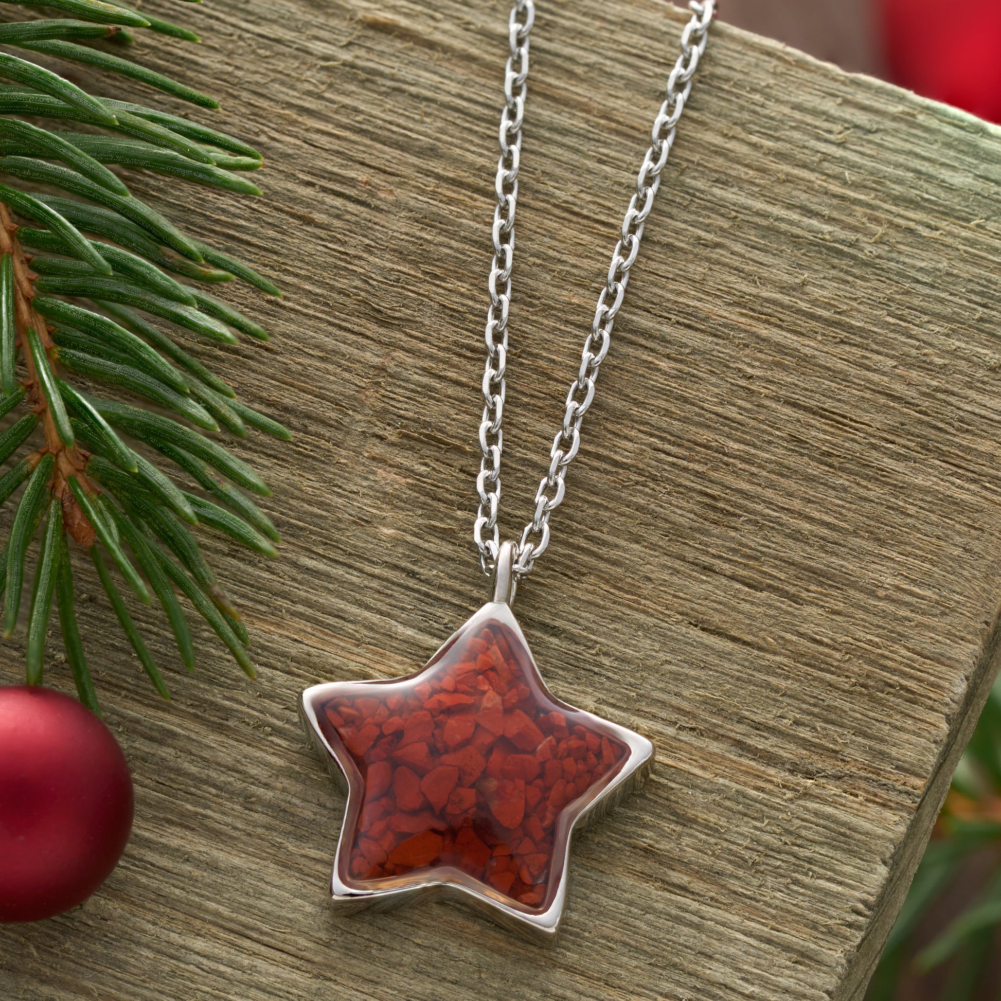 Handcrafted from brass and plated in rhodium for a sleek, polished sheen, this 16mm x 16mm star pendant features a gorgeous inlay of crushed jasper set in resin. The natural stone texture adds depth and warmth, creating a subtle yet radiant design perfect for the Christmas season and beyond. Suspended from an 18" stainless steel chain with a 2" extender, the necklace offers a comfortable, adjustable fit that complements both casual and dressy outfits.