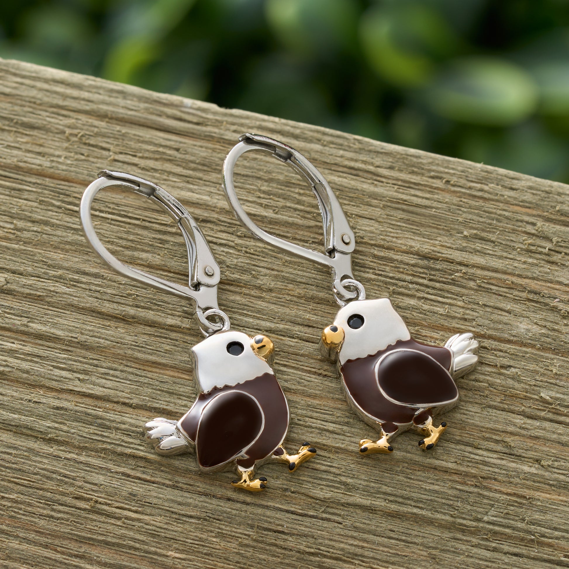 Each earring features a delicately enameled eagle pendant, suspended from a lightweight surgical stainless steel leverback hook. The rhodium finish adds texture and charm, making these earrings a perfect companion to both laid-back summer looks and nature-inspired ensembles.