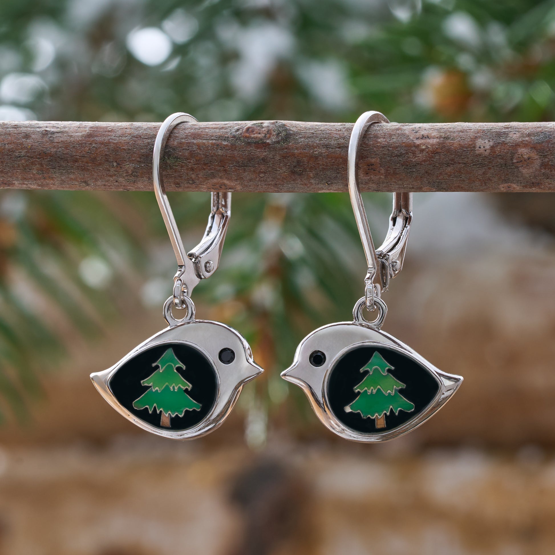Each bird is delicately crafted with evergreen-themed enamel in resin and set in rhodium-plated brass for a lasting shine. Inspired by the pine groves of Chadds Ford, Pennsylvania, these 15mm x 10mm earrings evoke the peaceful stillness of winter landscapes. Surgical stainless steel leverbacks offer a secure, hypoallergenic fit—perfect for sensitive ears and all-day wear.