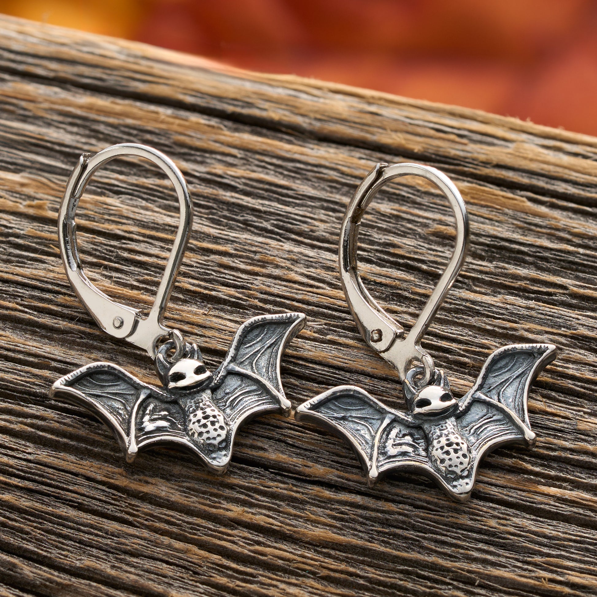 Handmade from brass and plated in vintage silver, each bat measures 19mm x 11mm and hangs from hypoallergenic surgical stainless steel leverbacks for comfort and security. With finely detailed wings and a rustic silver finish, these earrings capture the magic and mystery of the season while remaining versatile enough for everyday wear.
