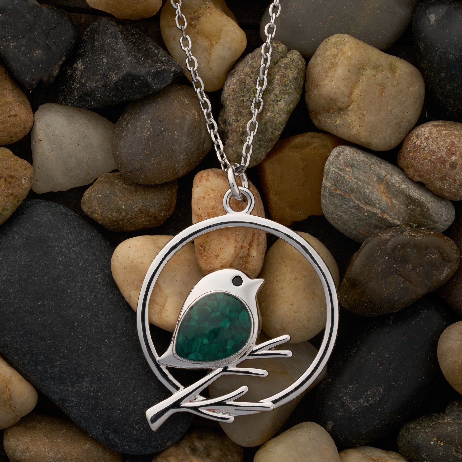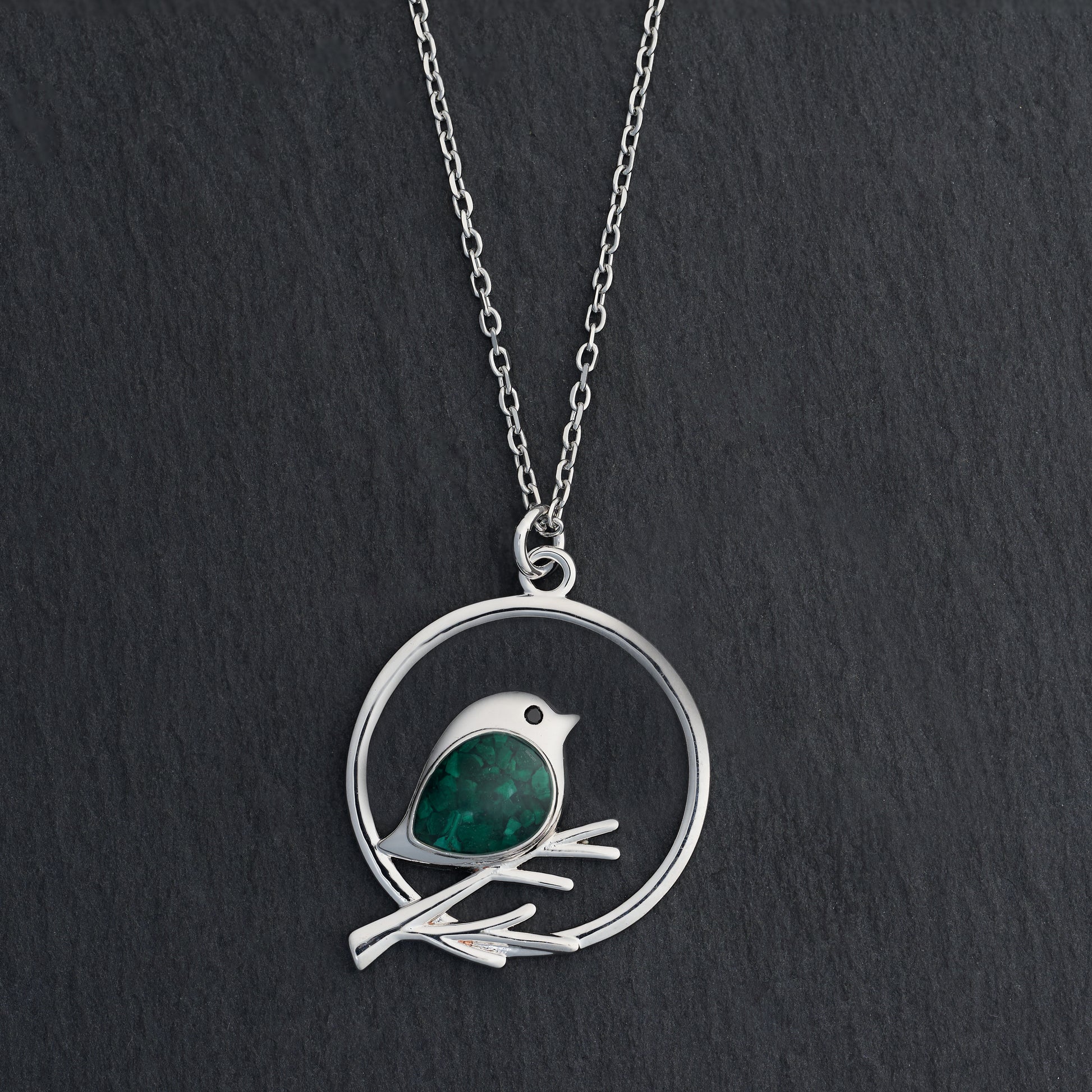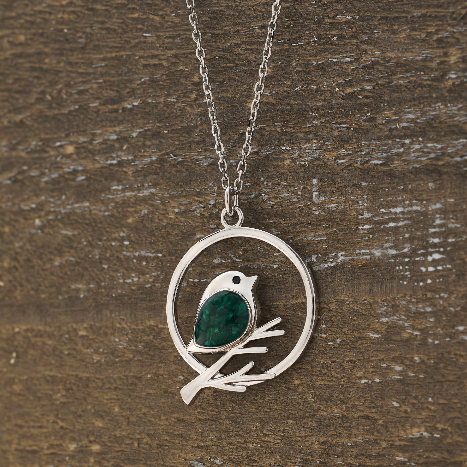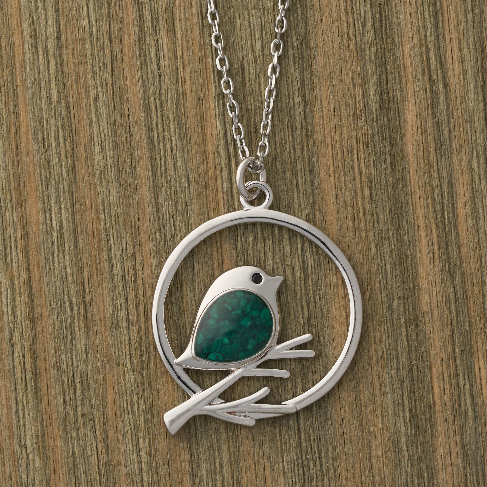 Featuring a delicate bird perched on a graceful branch, this rhodium-plated pendant is inlaid with crushed malachite—evoking themes of growth, balance, and transformation. Paired with a stainless steel chain, it’s a versatile piece that transitions effortlessly from workday to weekend.