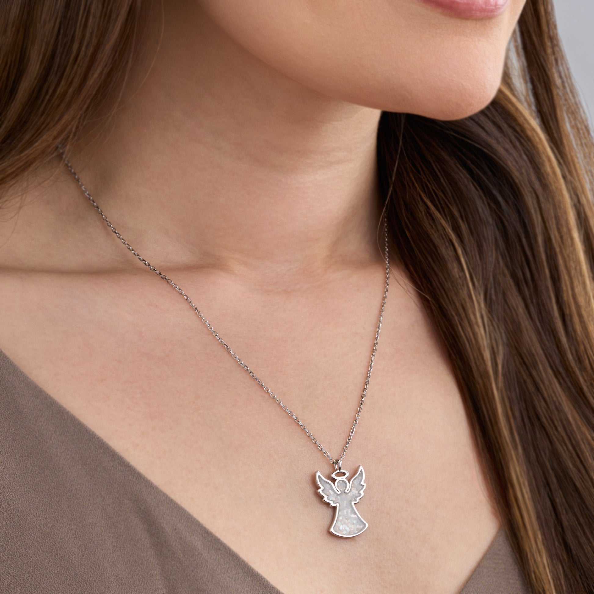 This coordinated set includes a matching angel necklace and leverback earrings, each handcrafted from brass and finished with rhodium plating for a polished shine. The classic angel outline—wings outstretched in a simple, cookie-cutter style form—is filled with crushed mother of pearl set in resin, creating a soft, luminous surface with natural iridescence. The necklace pendant (22mm x 18mm) hangs from an 18" stainless steel chain with a 2" extender, while the matching earrings (22mm x 18mm) are suspended from hypoallergenic surgical stainless steel leverback hooks for secure, comfortable wear.