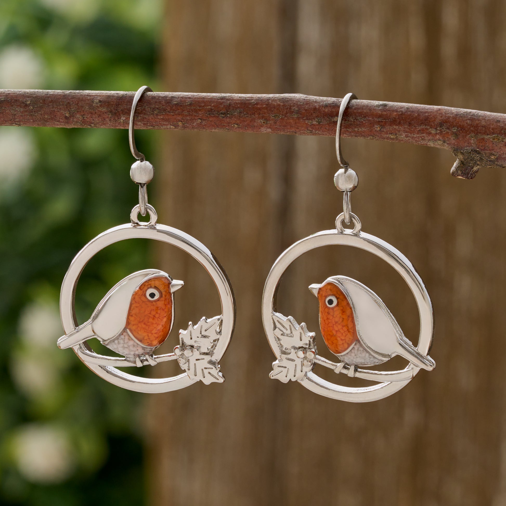 Each earring features a perched robin inlaid with a warm blend of orange and white sand, accented by a sparkling cubic zirconia eye. Finished in vintage silver over brass for a soft, rustic look, these earrings pair effortlessly with other nature-inspired pieces and make a thoughtful gift for bird lovers or collectors alike.