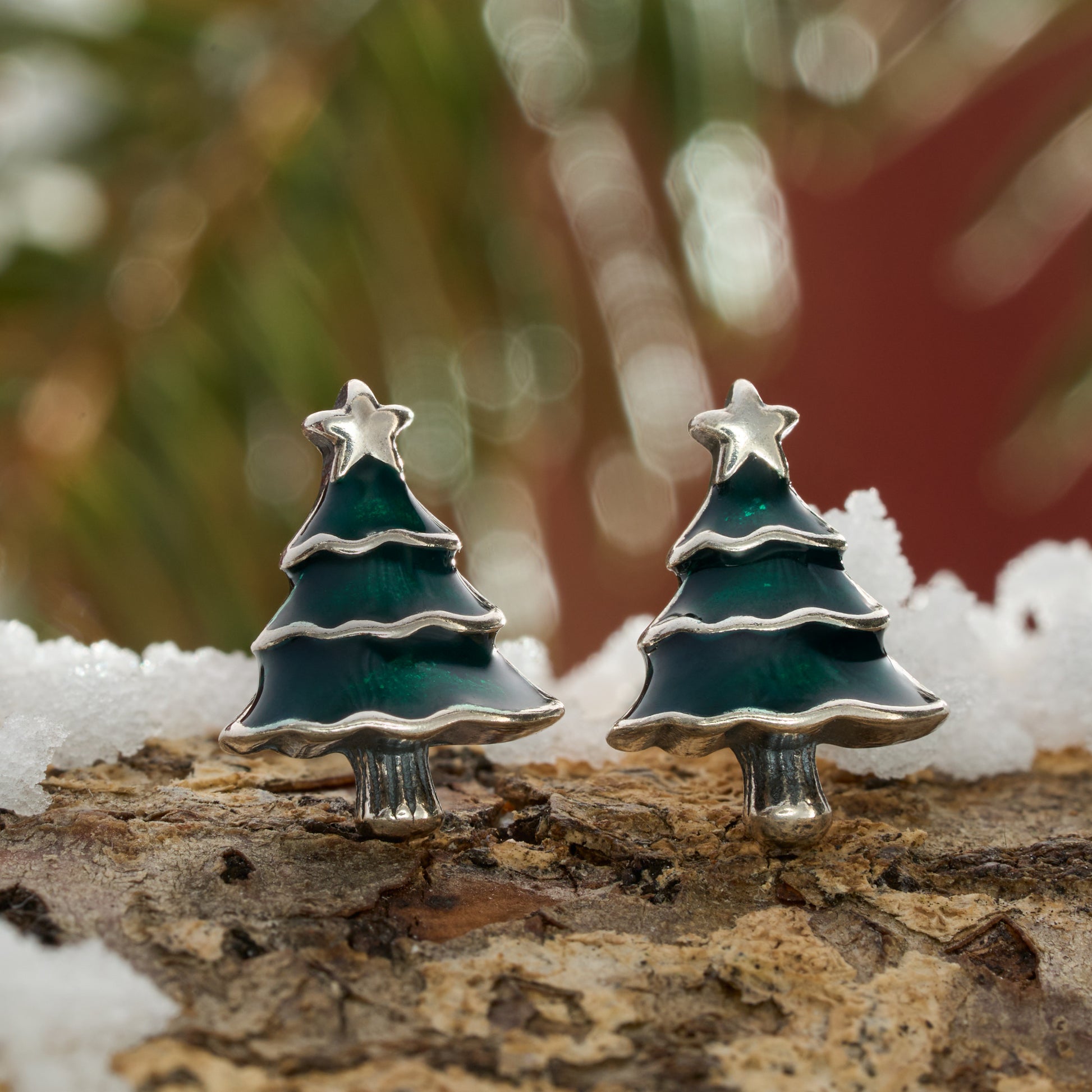 Crafted from sterling silver and plated in rhodium for a bright winter sheen, each earring features a beautifully detailed Christmas tree accented with rich green enamel. Measuring 10.3mm x 7.5mm, they are fastened by solid sterling silver ear posts & butterfly backings—lightweight, secure, and comfortable for all-day wear.