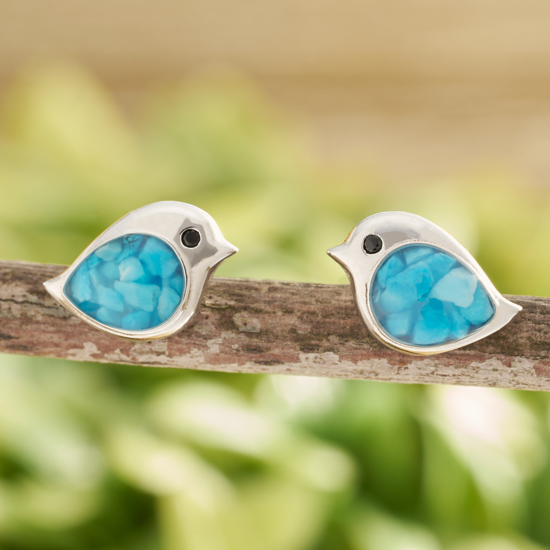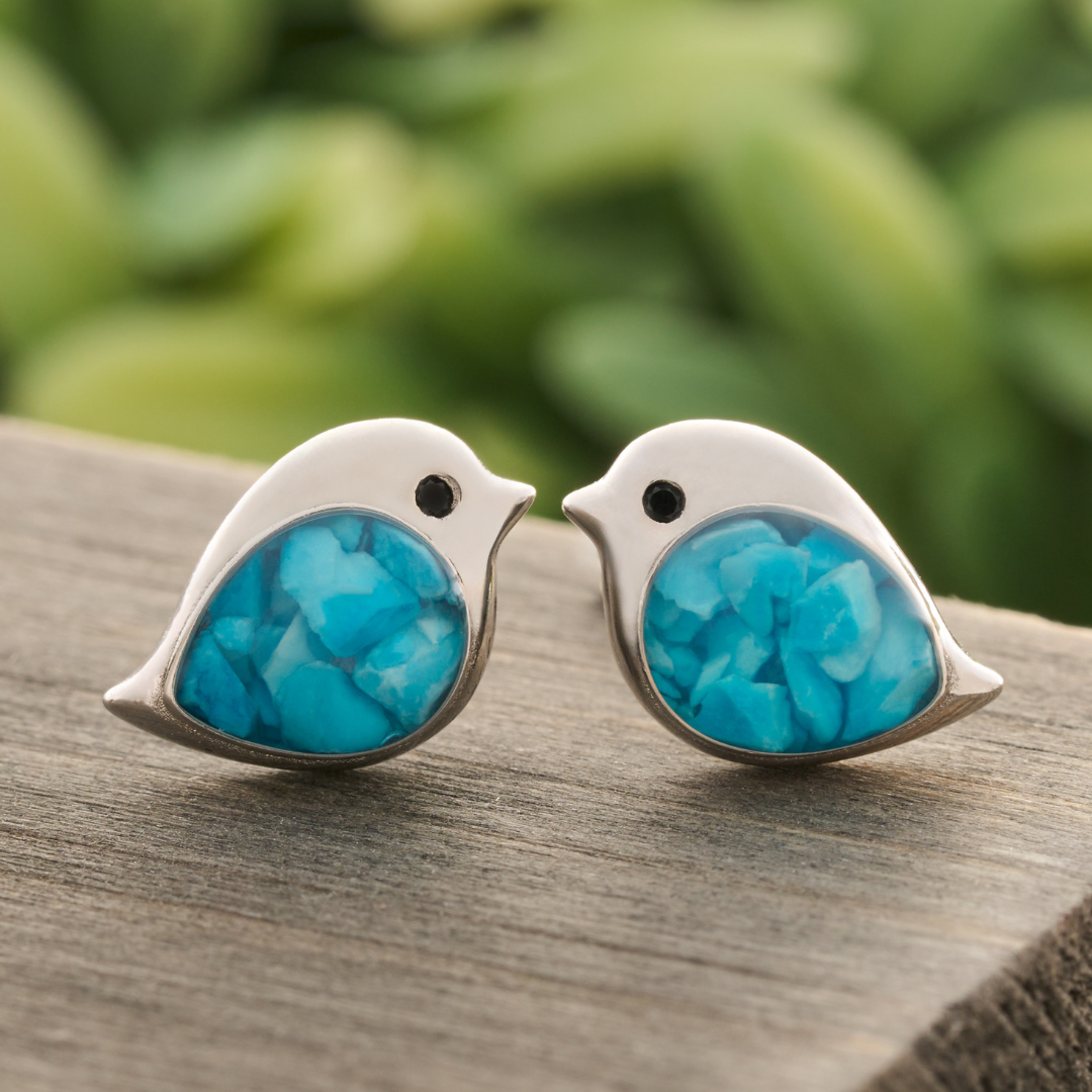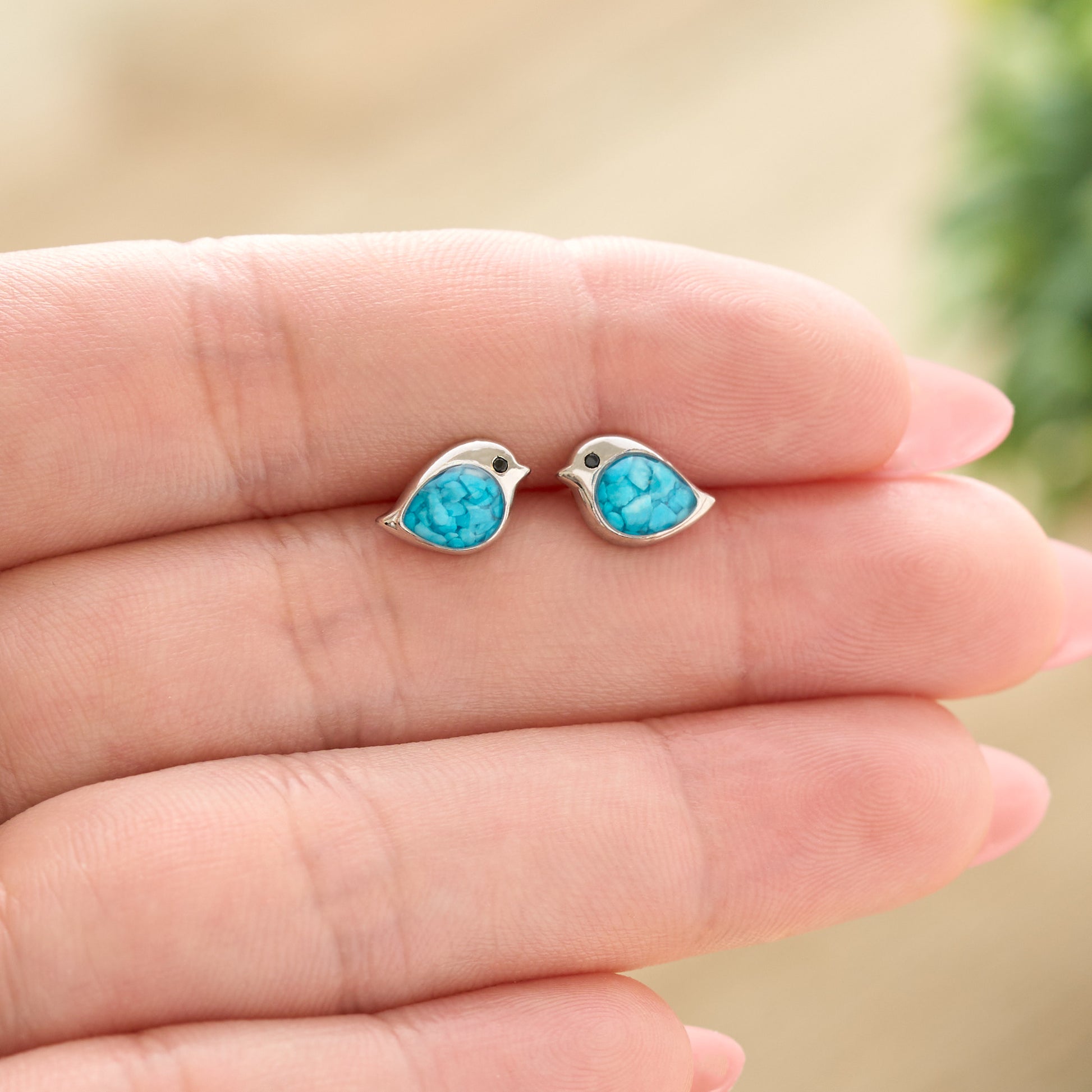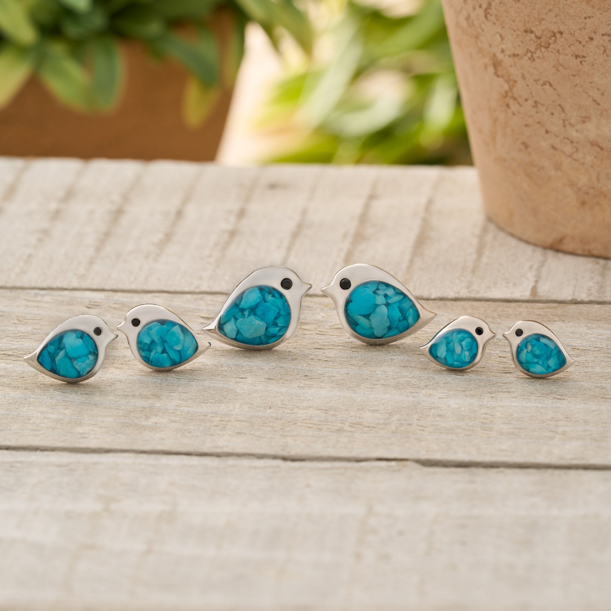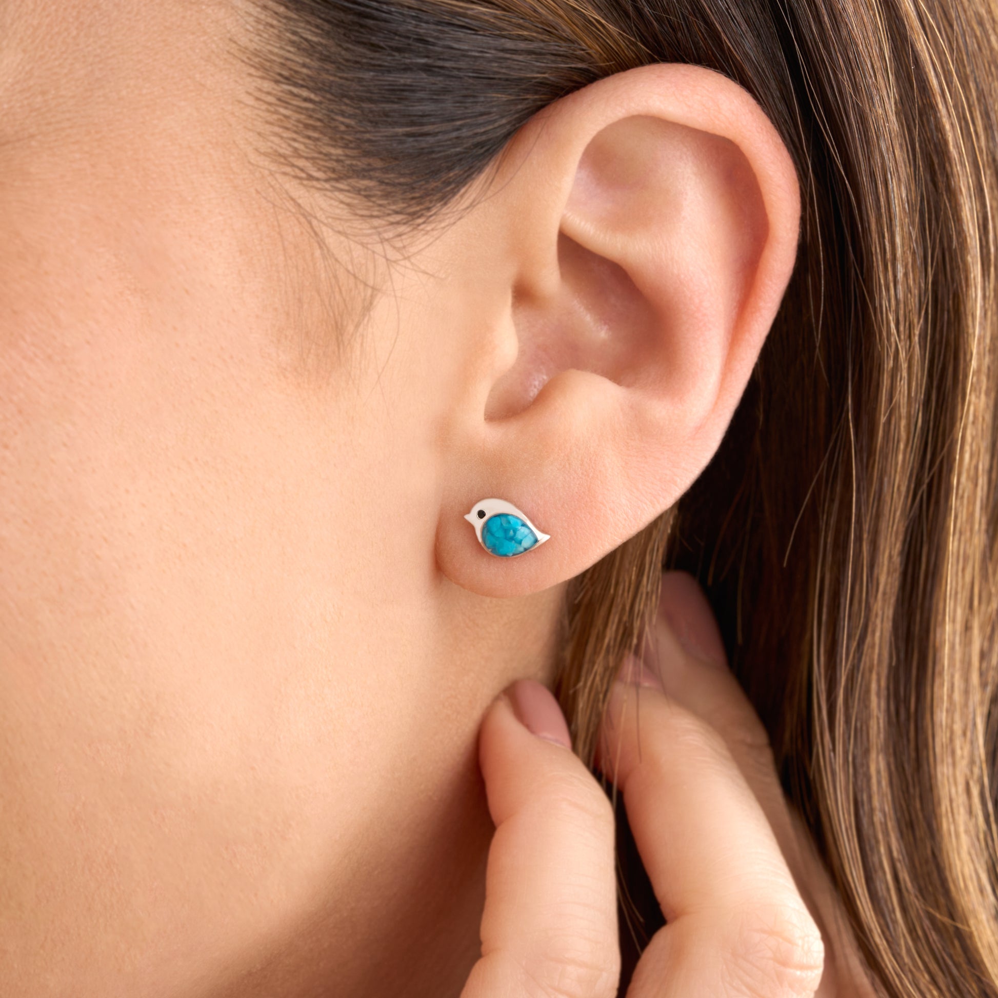 Each pair features a handcrafted bird inlaid with crushed turquoise, set in rhodium-plated sterling silver for lasting shine and comfort. Now available in three sizes—Dainty (Original), Medium, and Large—so you can choose the perfect scale for your style or stack them across multiple piercings.