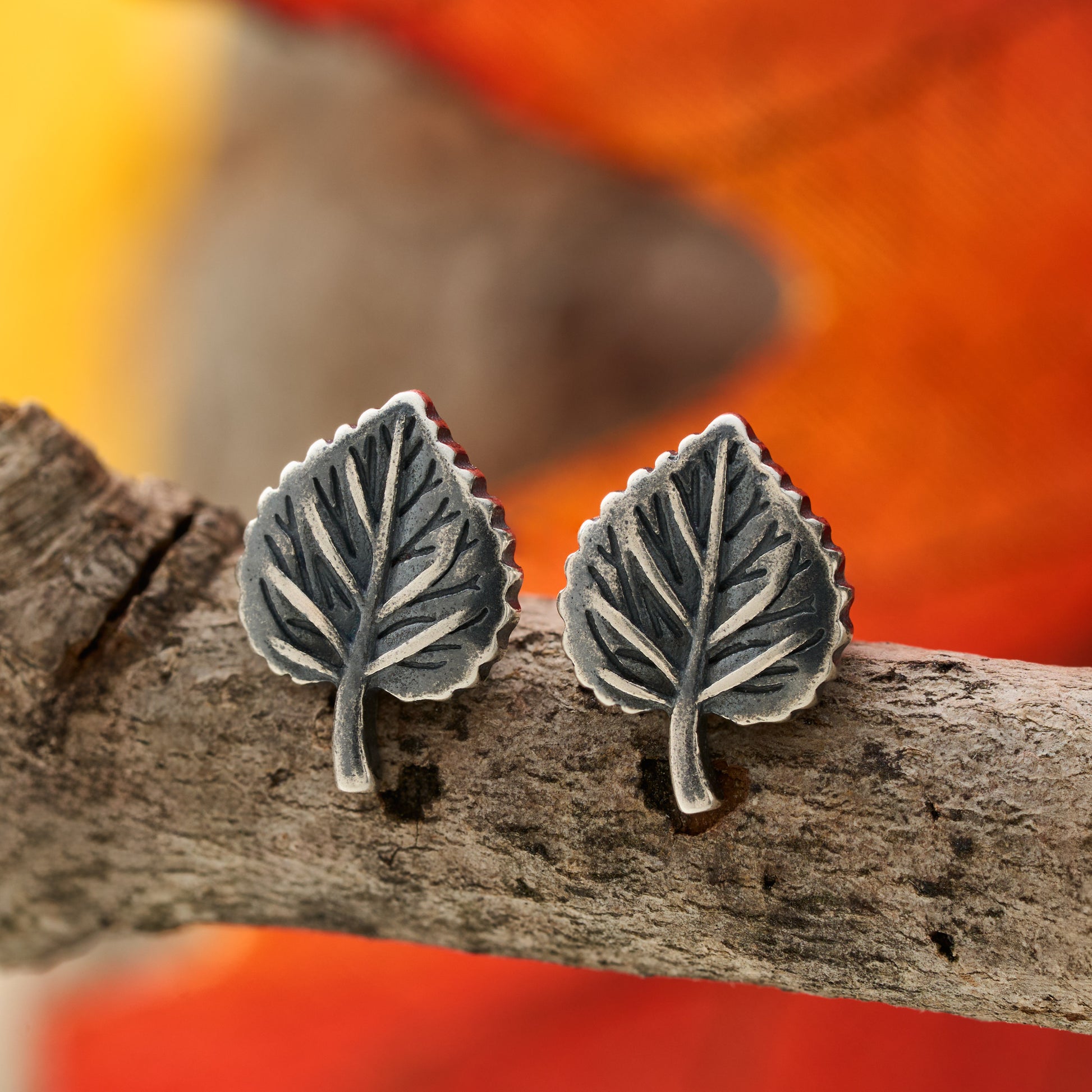 Handmade from solid sterling silver and finished in vintage silver plating for a softly aged sheen, each delicate aspen leaf (7mm x 10mm) mirrors the gentle curves and fine details of real foliage—symbolizing resilience, connection, and the quiet poetry of changing seasons. Designed with sterling silver posts and butterfly backings, these petite studs are comfortable, durable, and perfect for everyday wear.