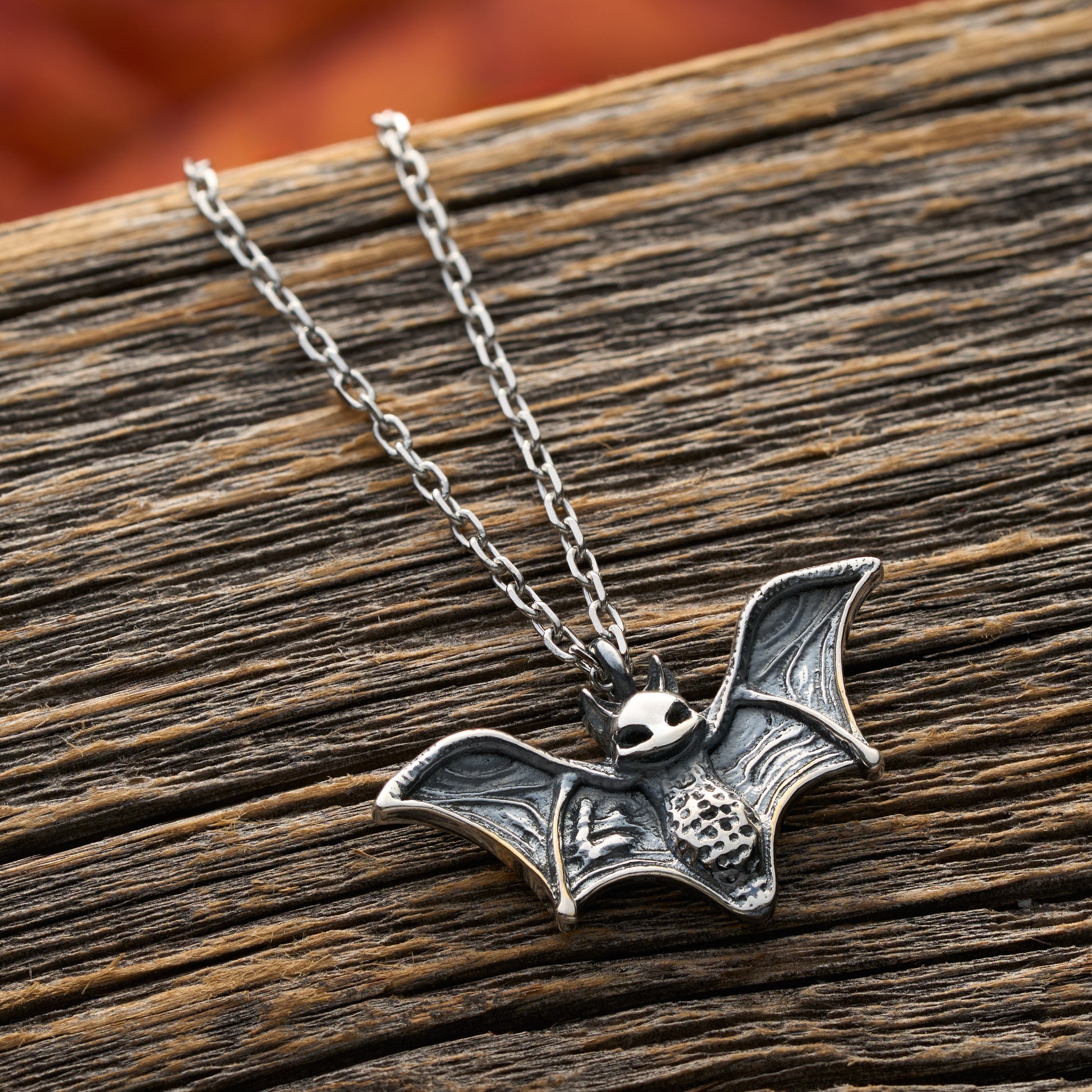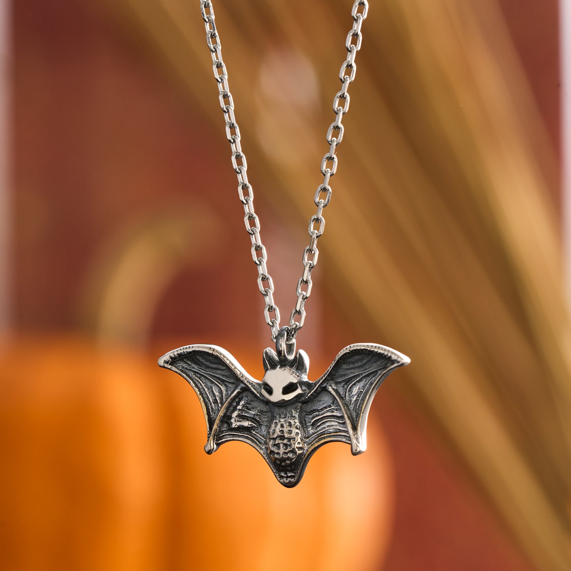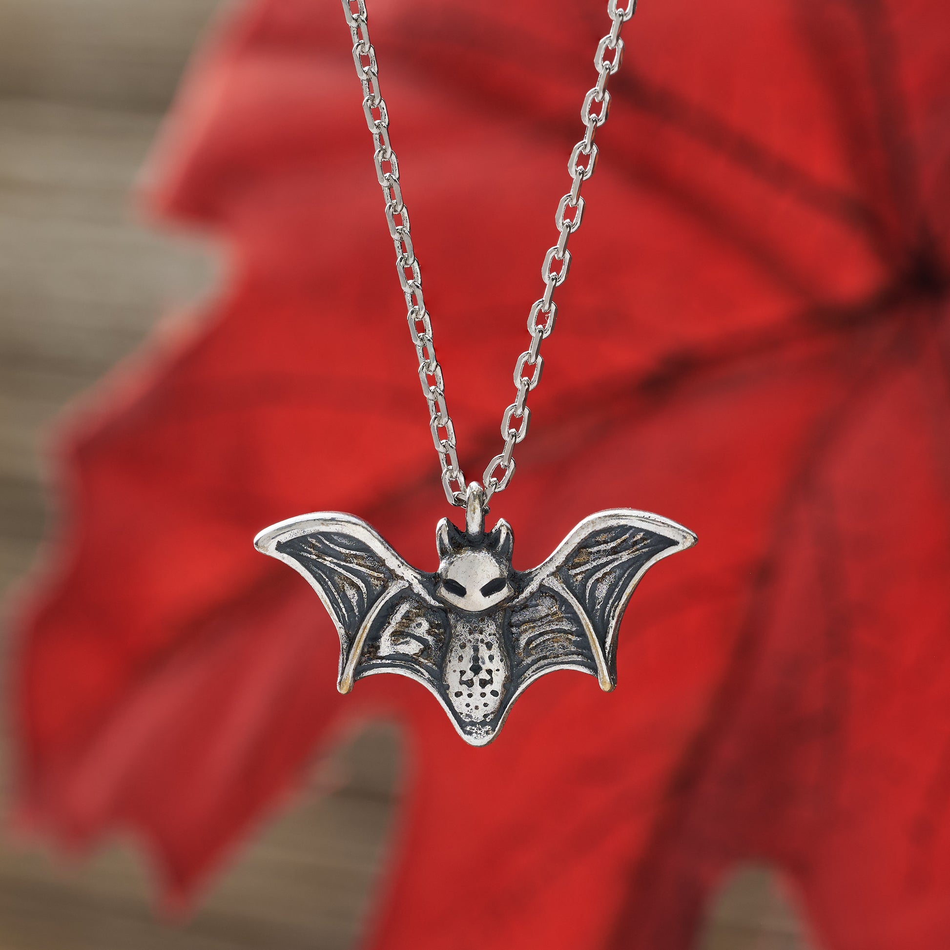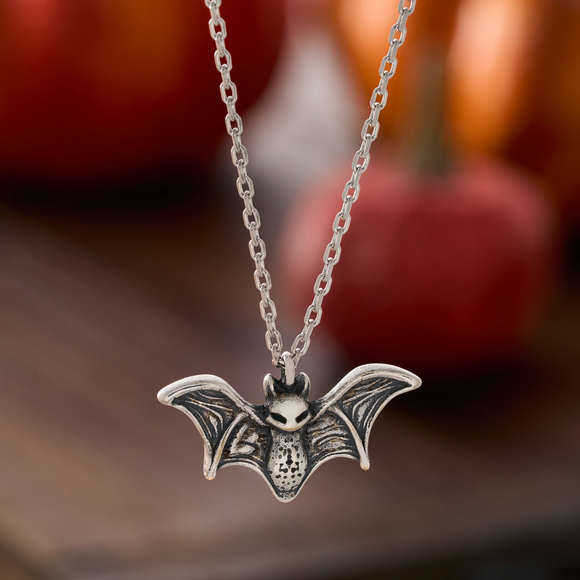 Handmade from brass and plated in vintage silver, the bat pendant measures 24mm x 15mm and hangs from an 18-inch stainless steel chain with a 2-inch extender for adjustable length. With its finely detailed wings and rustic silver finish, this pendant evokes the magic and mystery of the season while remaining versatile enough for everyday wear.