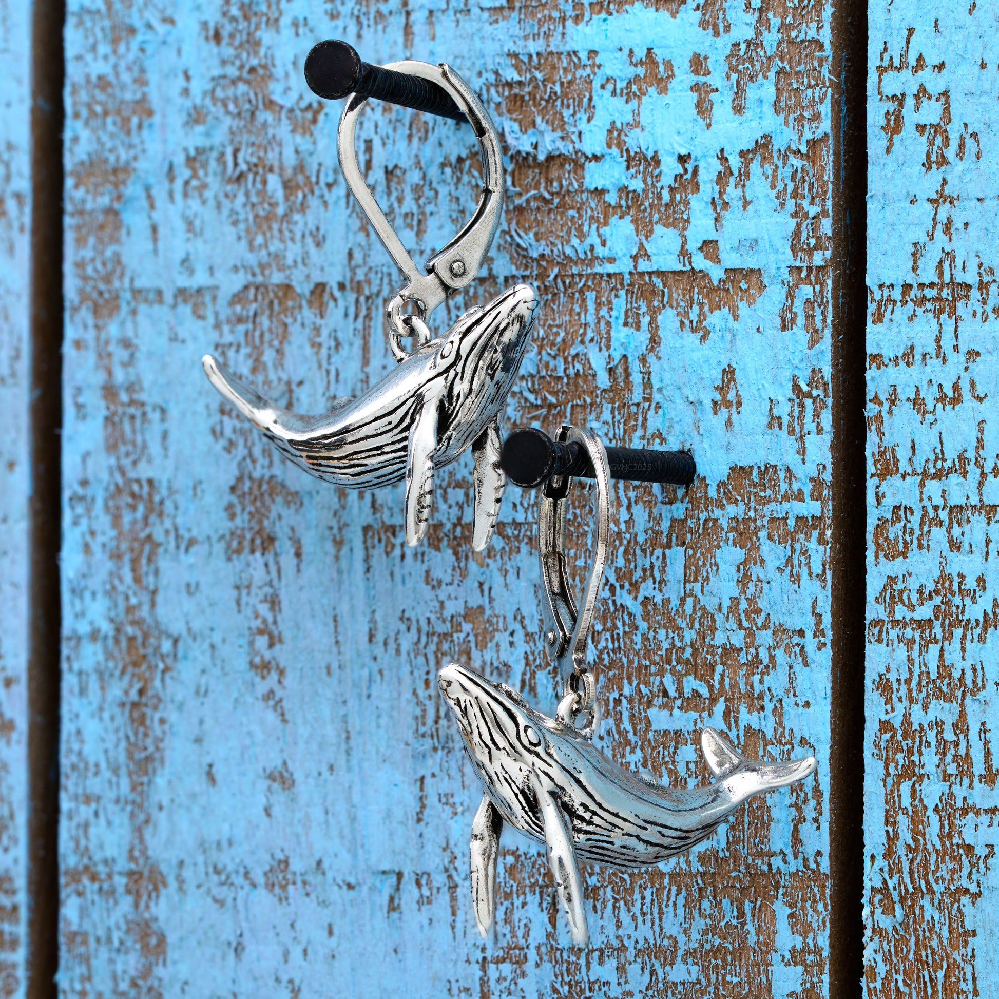 Each earring features a beautifully sculpted 3D humpback whale, brought to life in rustic silver plating over brass. Swinging from hypoallergenic leverbacks, these earrings are both expressive and comfortable—perfect for adding a bold, ocean-inspired accent to any outfit.