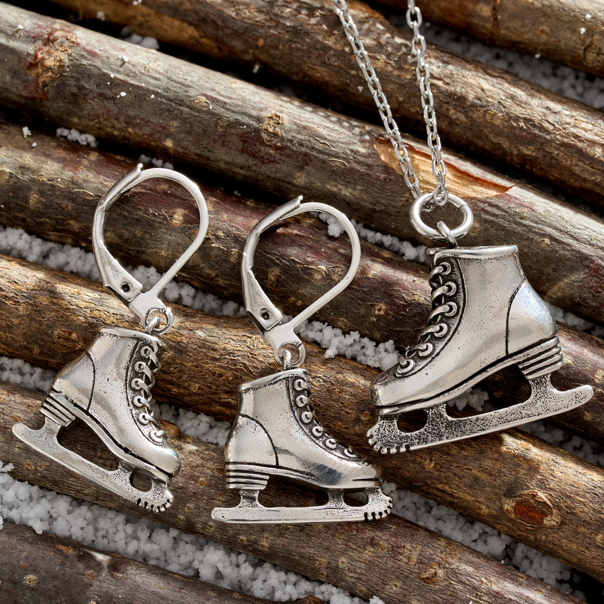 Crafted from brass and plated in vintage silver, the necklace features a 22mm x 20mm ice skate pendant suspended from an 18" stainless steel chain with a 2" extender for versatile wear. The coordinating earrings—each measuring 17mm x 17mm—hang from surgical stainless steel leverbacks that are lightweight, secure, and comfortable for all-day style.
