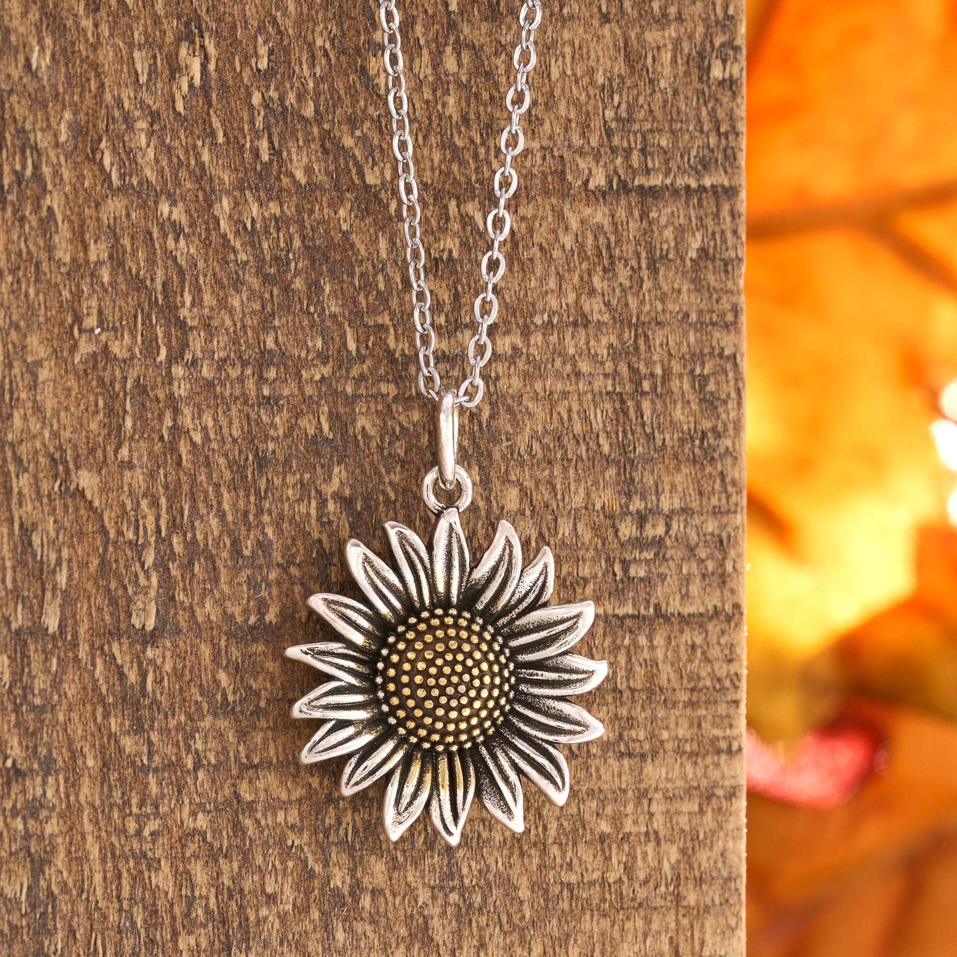 Inspired by the golden sunflowers that bloom across the hills of Chadds Ford, Pennsylvania, this handcrafted necklace features a 20mm sunflower pendant with a vintage silver finish and radiant gold center. Suspended from an 18" stainless steel chain with a 2" extender, it offers both comfort and charm for everyday wear or seasonal occasions.