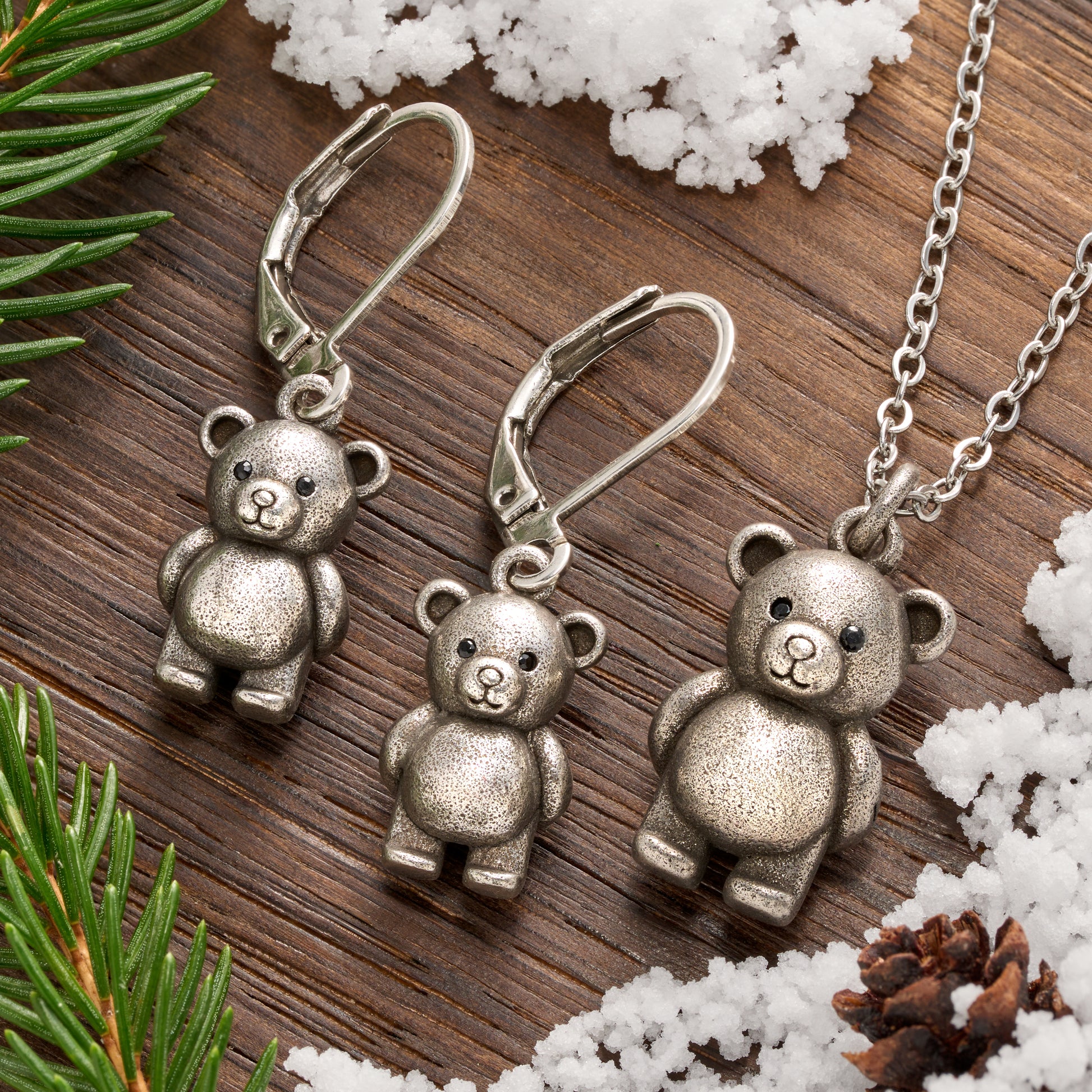 Handcrafted from brass and finished in vintage silver plating, both pieces feature sculptural depth and softly aged texture that enhance their timeless appeal. The necklace showcases a delicately detailed teddy bear pendant suspended from an 18" stainless steel chain with a 2" extender, while the matching earrings feature petite teddy bear charms hanging from secure, comfortable surgical stainless steel leverback hooks.
