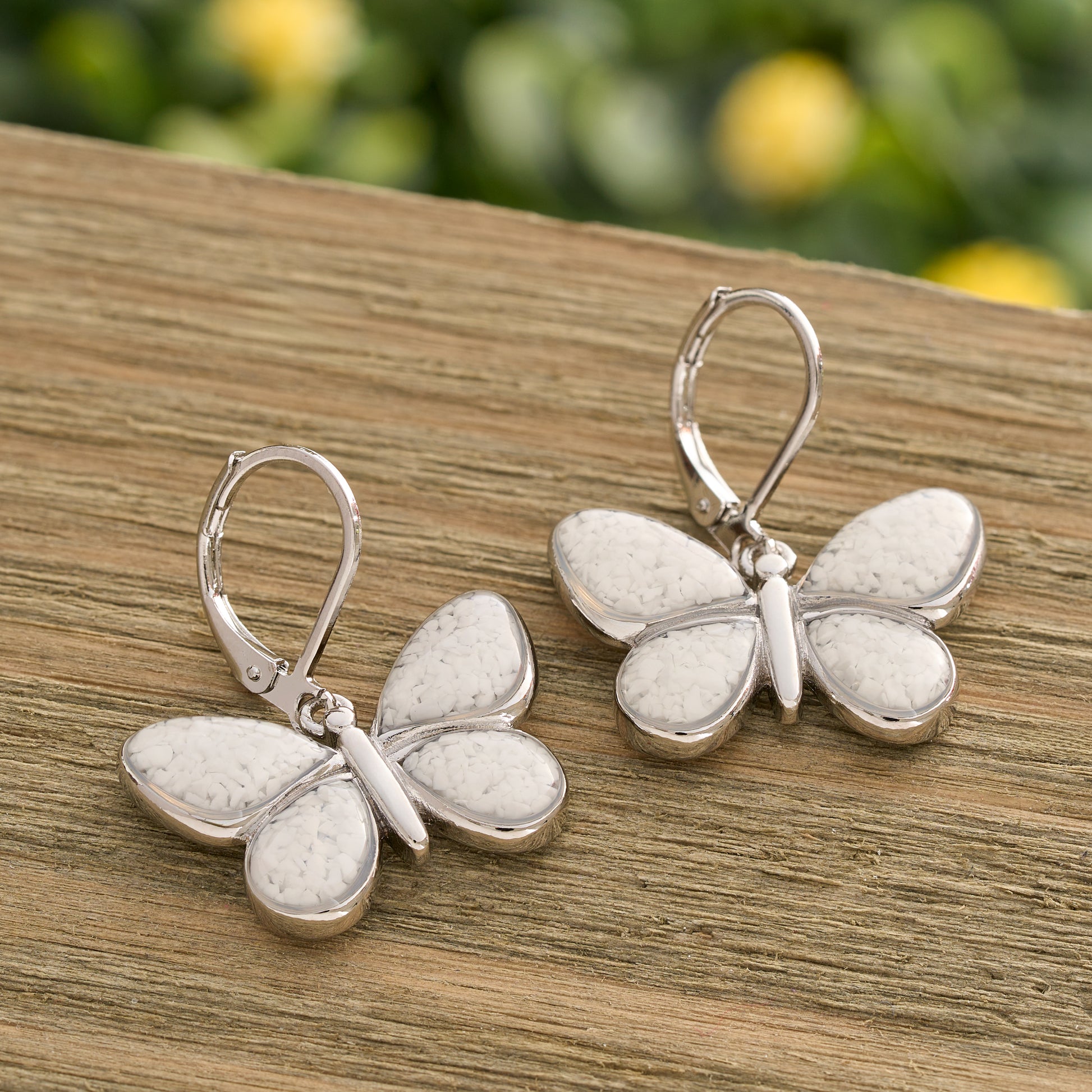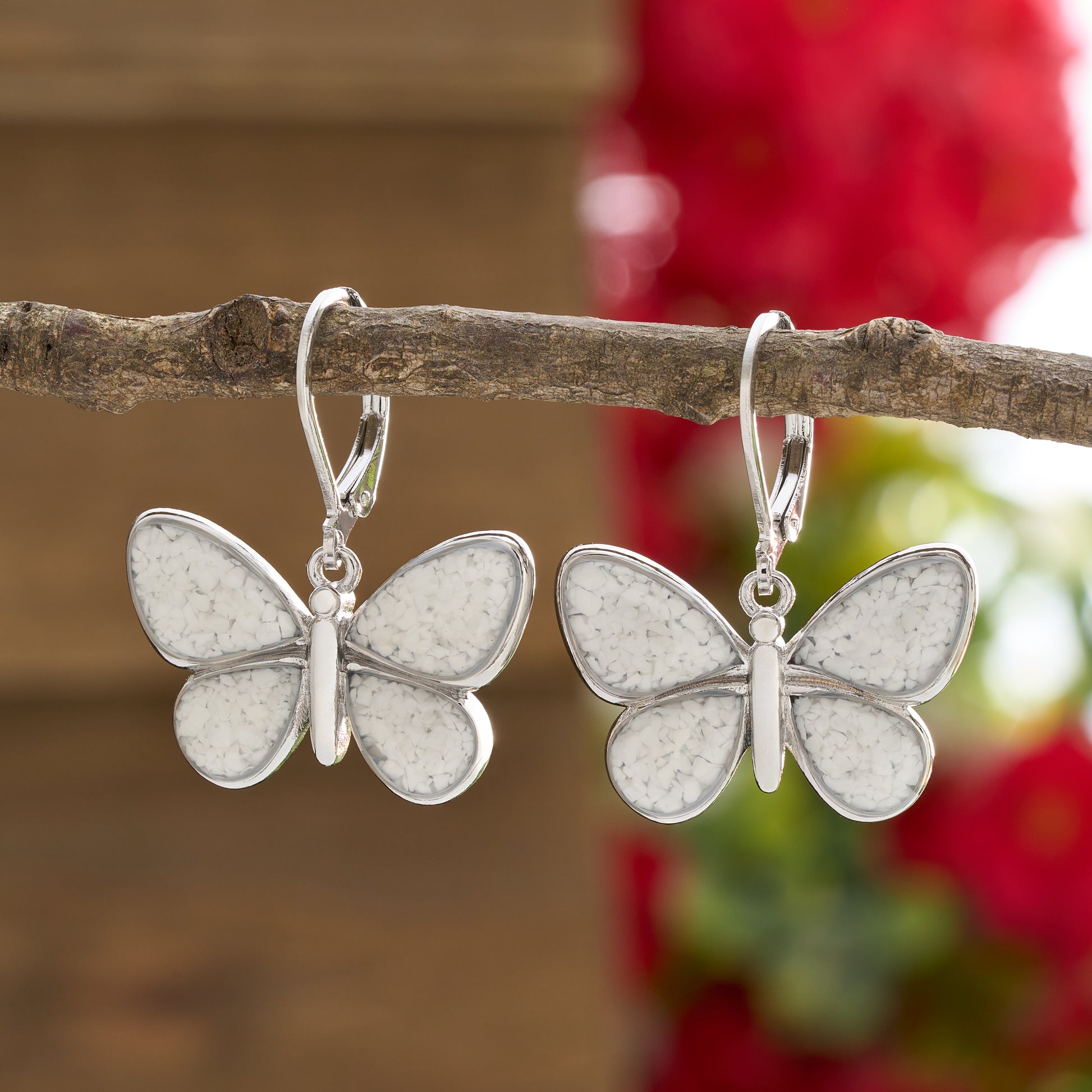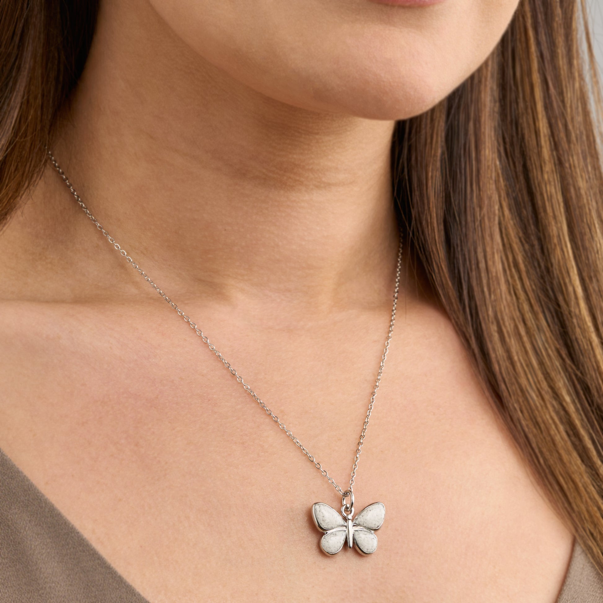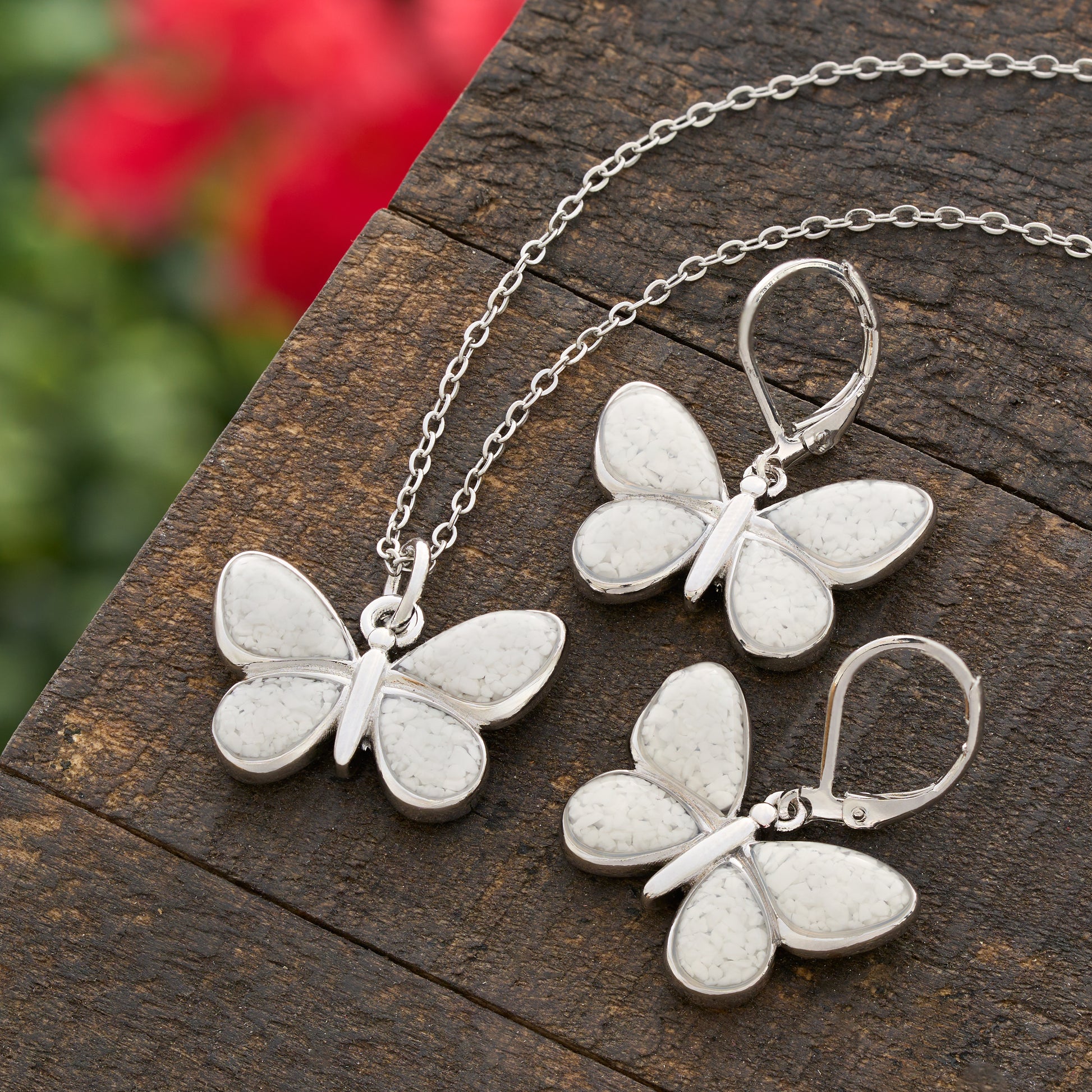 This handmade set features both the White Glass Butterfly Necklace and matching Leverback Earrings, each showcasing butterfly-shaped pendants filled with crushed white glass in resin. Rhodium plating over brass gives the pieces a sleek, modern shine, while surgical stainless steel leverbacks and an 18" stainless steel chain with a 2" extender ensure comfort and versatility. With pendants measuring 23mm x 16mm, both the necklace and earrings strike the perfect balance between delicate and eye-catching.